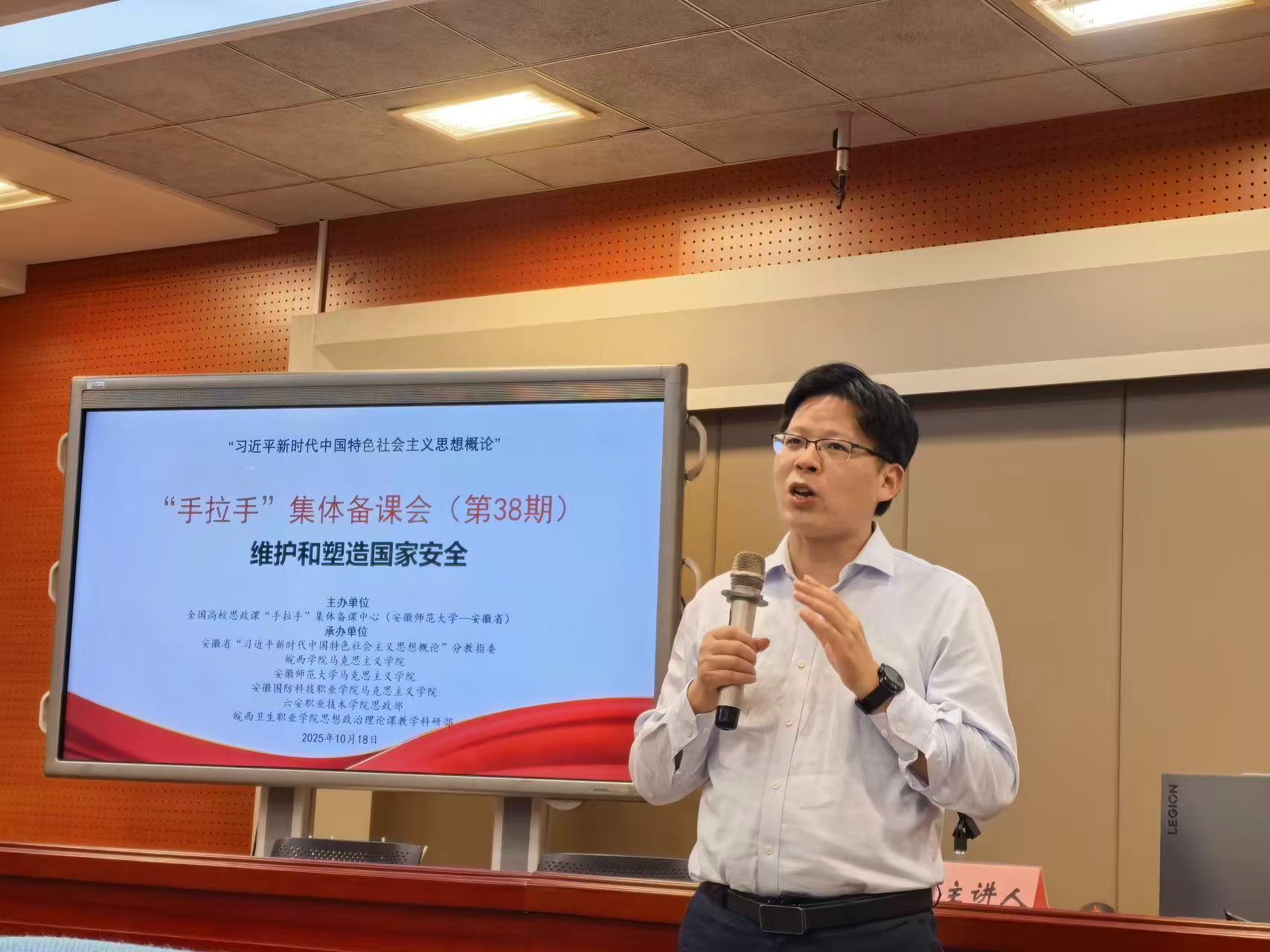 10月18日下午,由全国高校思政课“手拉手”集体备课会中心(304am永利集团-安徽省)主办,皖西学院永利集团304am、永利集团304am、安徽国防科技职业学院永利集团304am、六安职业技术学院思政部、皖西卫生职业学院思想政治理论课教学科研部与安徽省《习近平新时代中国特色社会主义思想概论》分教指委共同承办的全国高校思政课第38期“手拉手”集体备课会在皖西学院敏行楼3楼录播室线上线下同步举行。