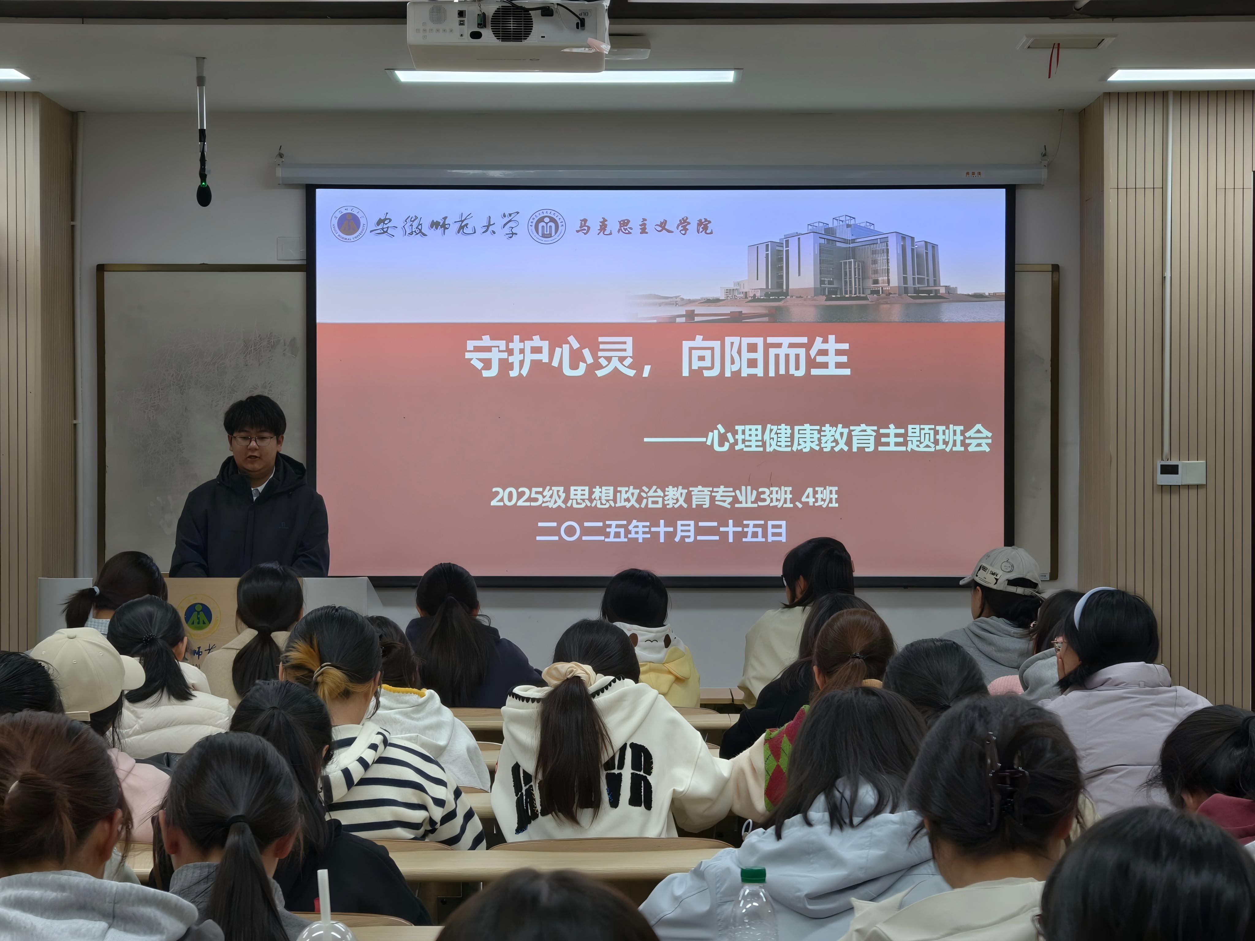 为提升学生心理健康素养,培养学生积极乐观的心态,10月25日晚,2025级思想政治教育专业3班、4班全体同学在望道楼E204教室组织开展了以“守护心灵,向阳而生”为主题的心理健康教育主题班会。本次班会由心理委员李元皓和刘宜佳主持。