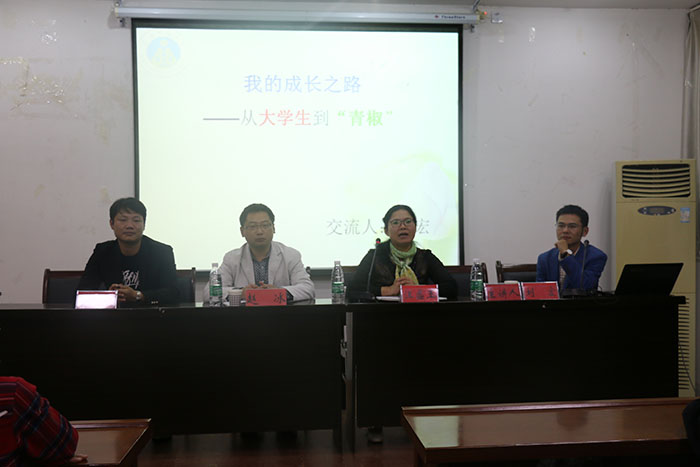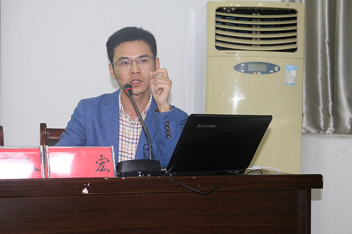 汪盛玉副院长首先向新生们介绍我院基本情况,并对刘宏老师做了详细的介绍。随后,刘宏老师以我的成长之路——从大学生到“青椒”为题,介绍了自己从大学本科至博士阶段的学习经历与人生感悟。他通过“我是谁”、“谁是我”的设问,告诉大家“我就是我”。为了帮助同学们成为更好的自己,他对同学们提出两点建议,希望同学们在学习上能培养兴趣,在生活上能改变气质。他通过“我干了什么”,介绍了自己的奋斗经历,讲述了就业和考研的两种选择各自的几种可能性,为同学以后做选择提供参考。他还和同学们分享了自己读硕读博的感受,将“不论前路几曲折,我把天地做道场”赠送给同学们,期盼同学们能有美好的未来。最后,4位老师详尽且风趣地回答了同学们的提问,师生间进行了良好的交流。