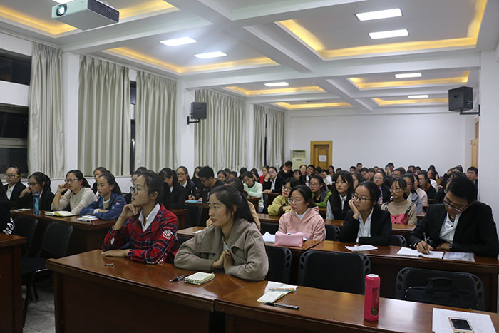 本网讯(文/王海燕 摄/赵文涵)为帮助大一新生更快适应大学生活,明确自己的人生目标,学院于10月25日晚7点在五楼会议室召开“青年博士论坛”主题讲座。本次讲座由副院长汪盛玉教授主持,刘宏老师主讲,赵冰副教授、辅导员夏盼盼老师以及17级全体学生参加此次活动。