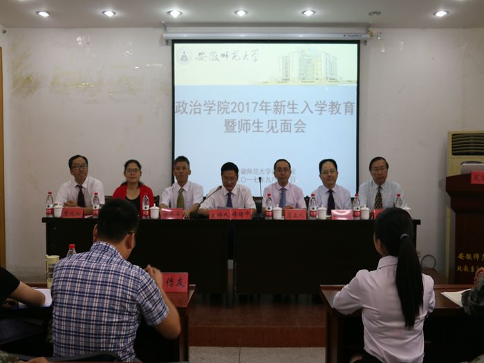 本网讯(文/摄 朱庆丰)为加强师生之间的交流,帮助2017级新生尽快适应大学生活。学院于9月15日上午九点在学院五楼会议室举办了2017级新生入学教育暨师生见面会。出席本次见面会的有学院党委书记傅绪中、院长高正礼、副书记梁齐军、副院长姚宏志、汪盛玉、潘新安和陈九如、教师代表单传友,2017级本科生辅导员夏盼盼、老生代表王诗茹及2017级全体新生。大会由学院党委书记傅绪中主持。