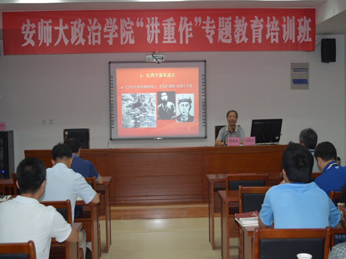 本网讯(政治学院 周楠、夏盼盼)为扎实推进“两学一做”学习教育常态化制度化,深入开展“讲政治、重规矩、作表率”专题警示教育,8月10日、11日,政治学院“讲重作”专题教育培训班在金寨县委党校(金寨干部学院)开班,学院党委书记傅绪中、党委副书记梁齐军、副院长陈九如等党政领导以及部分教师党员参加了此次培训活动。