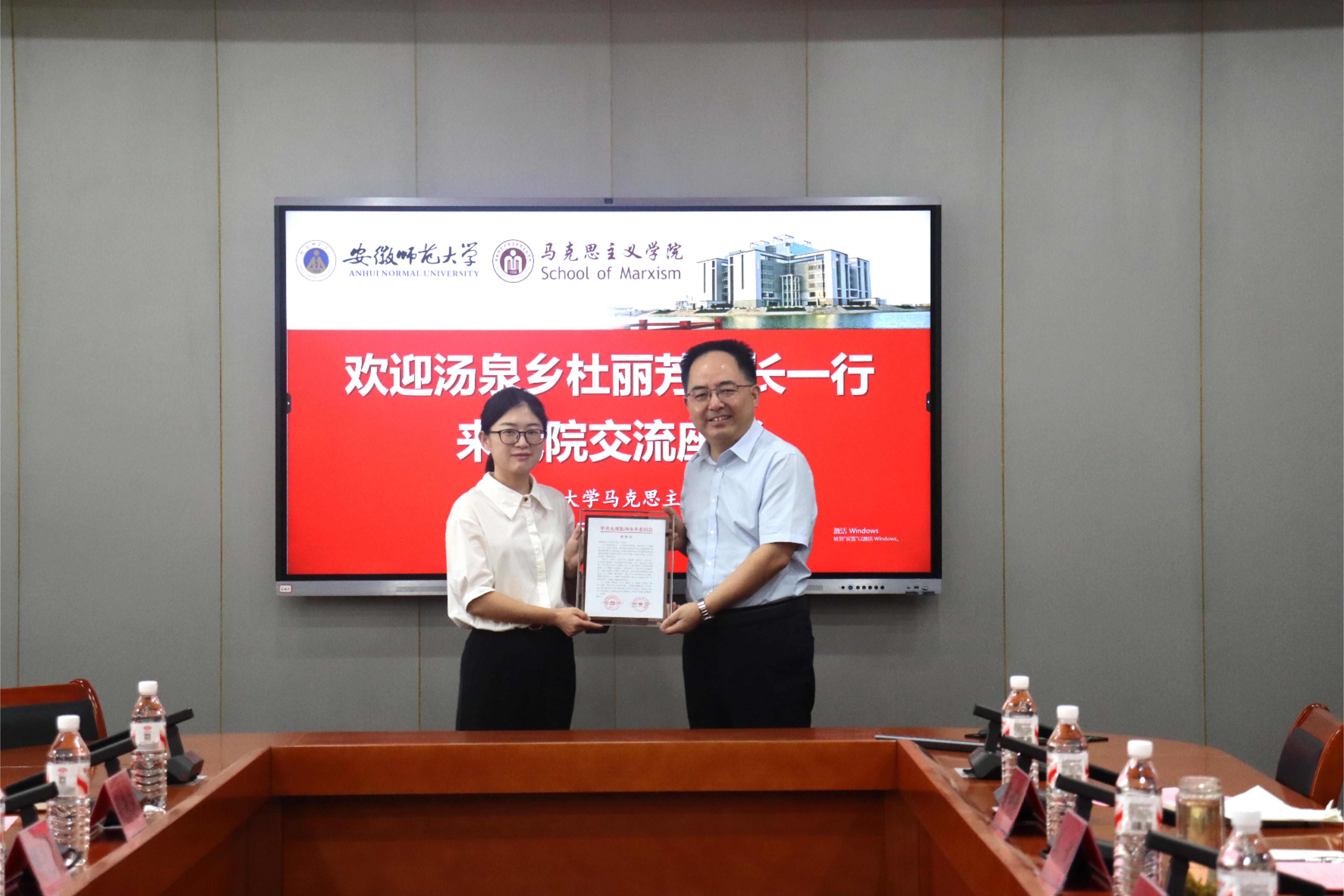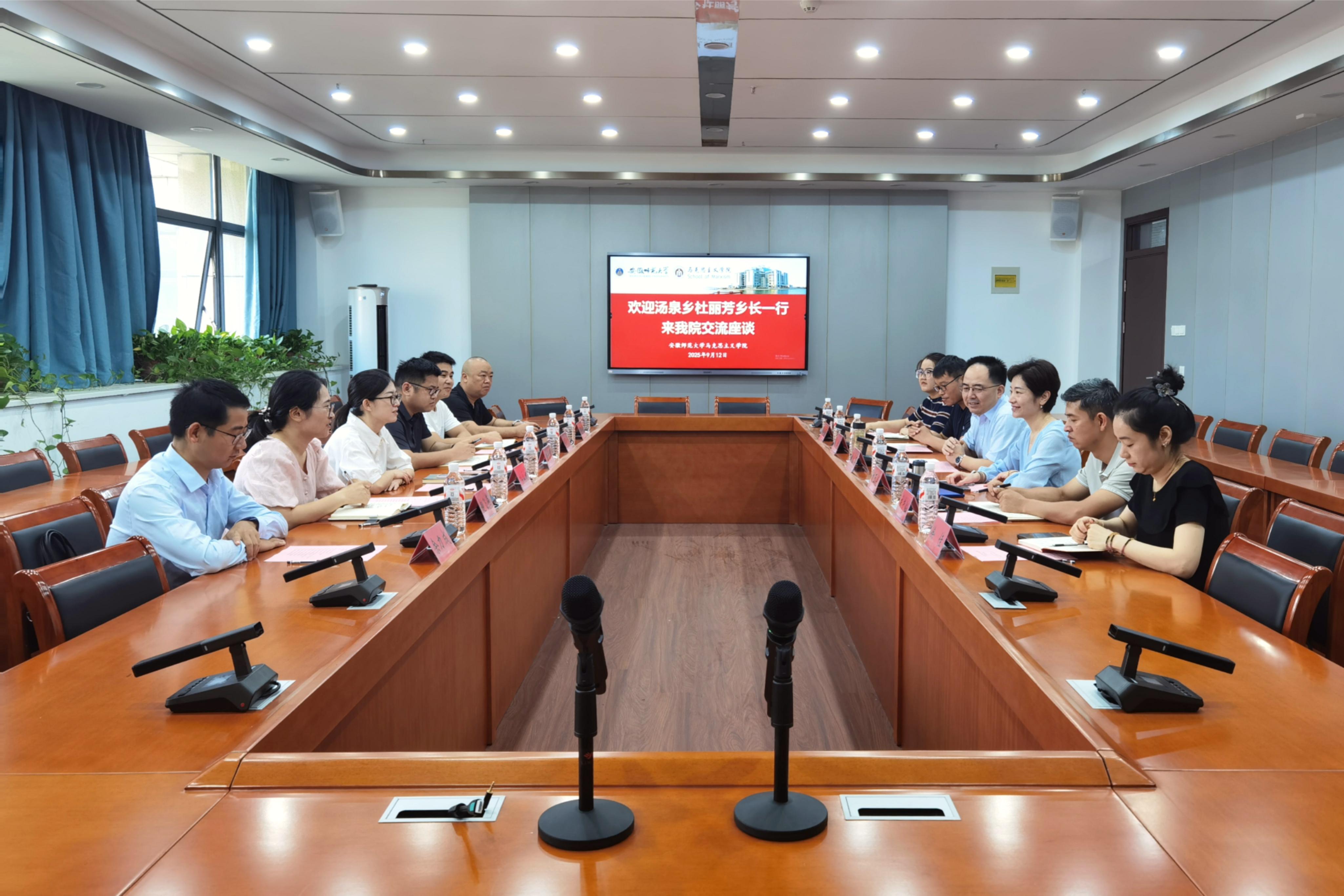 会上,姚宏志代表学院向汤泉乡领导的到来表示热烈欢迎,并介绍了学院历史、学科建设与发展现状,表示学院坚持教学、科研、人才培养与社会服务协同发展。杜丽芳感谢学院的热情接待,高度赞扬我院师生对汤泉乡发展的支持,肯定我院连续五年在汤泉乡开展社会实践,带动当地发展的事迹,真正赋能乡村振兴。最后,双方表示,校地牵手是一次共赢,今后将持续细化合作方案、充分发挥各自优势,在校地合作与乡村振兴等方面实现互利共赢。
