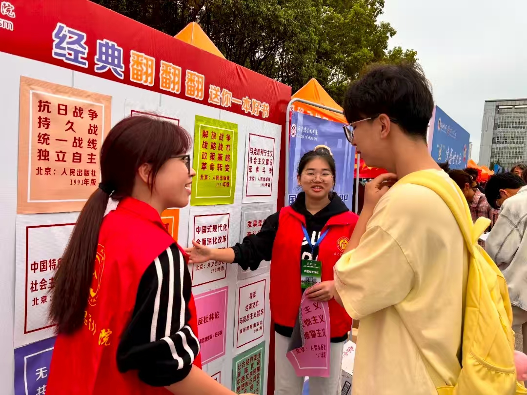 学院在延续签名墙、暖心礼包等传统迎新环节的基础上,深度融合学科专业特色,创新打造“经典翻翻翻”互动体验活动。在活动现场,志愿者们通过将马克思主义经典著作与关键词创意结合的形式,热情引导新生参与活动,并向每位参与的同学赠送学院精选读物。“太惊喜了!”“这正是我们马院学子的专属礼物。”新生在趣味探索中感悟理论魅力,在互动体验中坚定理想信念。