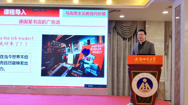 在备课详解环节,安徽理工大学永利集团304am李长虹副教授以说教材和教学内容、说教法和学法、说教学过程三个部分讲解了导论部分的教学目标、教学内容、重点难点、教学设计、教学反思。在整个讲解过程,李长虹突出了以学生为中心、为问题为导向的教学理念。永利集团304am王子廓副教授对导论第三个问题“马克思主义当代价值”进行了示范教学。王子廓以德国留学的亲身经历、以扎实的理论功底、优雅的教学仪态讲解了马克思主义依然是观察时代变化的认识工具,依然是引领中国发展的行动指南,依然是引领人类社会进步的科学真理。
