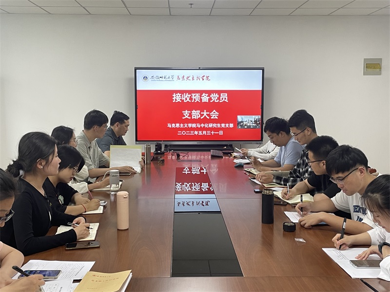 5月31日下午,马中化研究生党支部在文科大楼G411办公室召开支部大会,讨论接收王玮泽同志为预备党员和闫志远、吴俊、张珈珲三位预备党员转正的相关事宜。院党委委员、副院长李祥兴到会指导,会议由支部组织委员洪浪颖主持,支部全体党员参加。