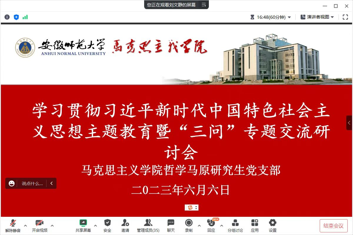 6月6日上午,永利集团304am哲学马原研究生党支部线上开展以学习贯彻习近平新时代中国特色社会主义思想主题教育暨“三问”专题交流研讨会为主题的党日活动。此次活动由支部书记张维欣主持,全体党员同志参加。