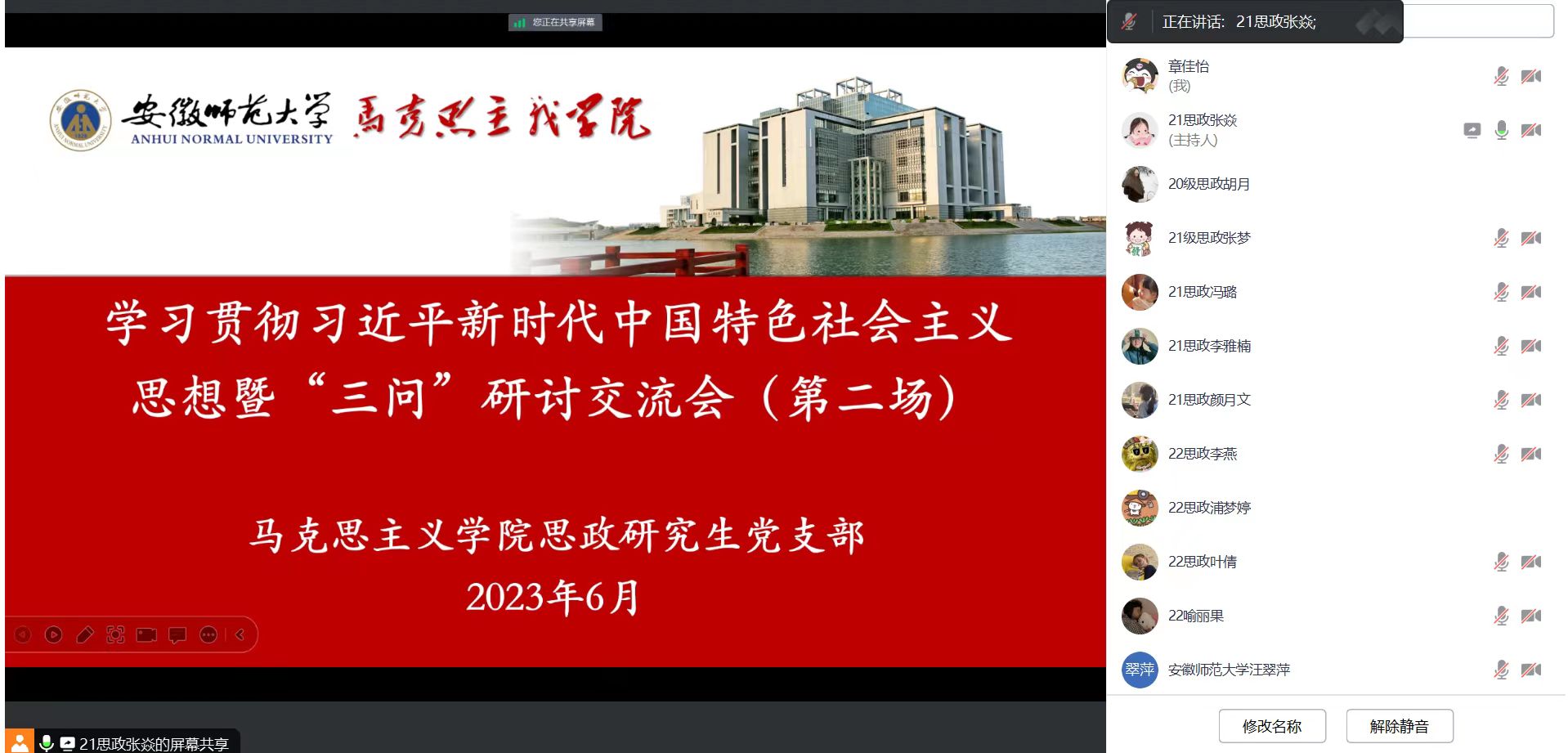 6月30日晚,思政研究生党支部在腾讯会议开展学习贯彻习近平新时代中国特色社会主义思想“三问”交流研讨会(第二场)。本次活动由组织委员张焱主持,支部全体党员、入党积极分子参加。
