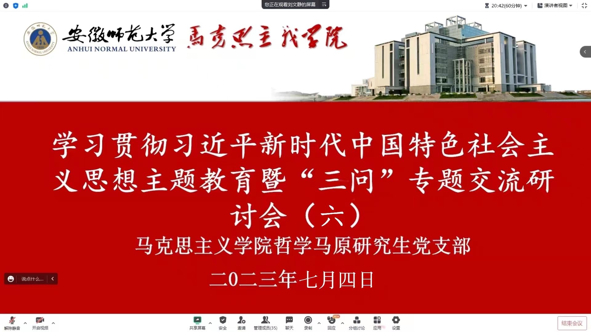 7月4日上午,永利集团304am哲学马原研究生党支部在腾讯会议开展学习贯彻习近平新时代中国特色社会主义思想主题教育暨“三问”交流研讨会。此次活动由支部书记张维欣主持,全体党员同志参加。