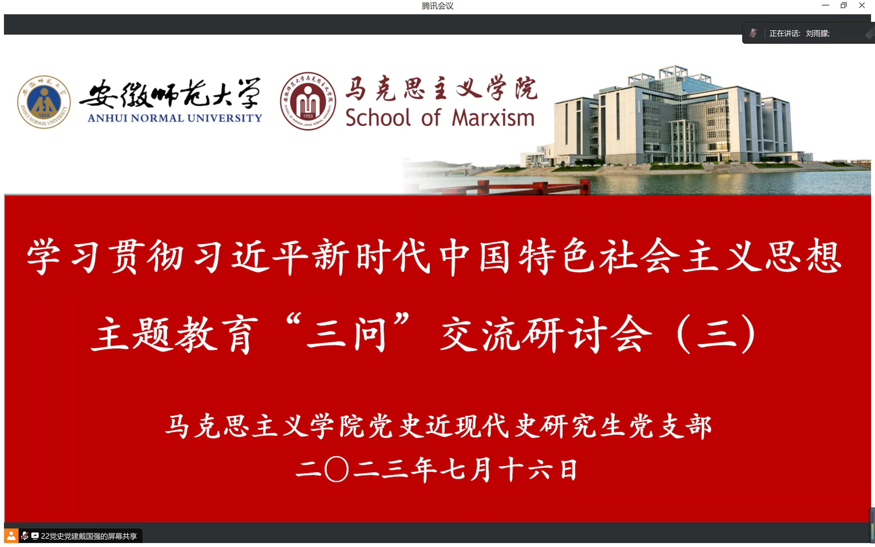 7月16日下午,党史近现代史研究生党支部在腾讯会议开展第三场主题教育集中学习会和“三问”交流研讨活动。此次活动由支部书记陶娴静主持,支部全体党员同志参加。