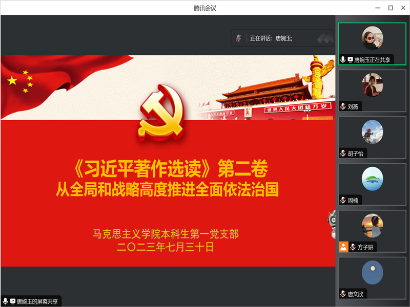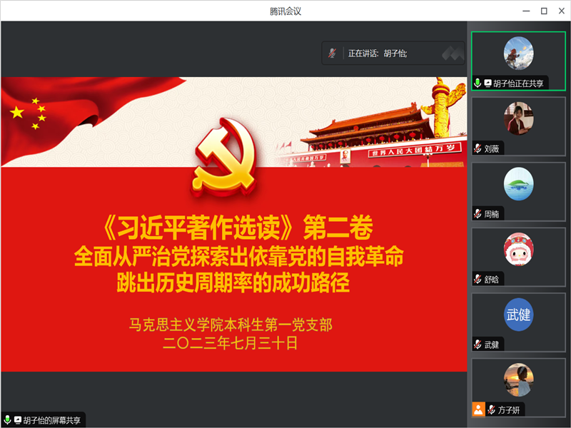 7月30日晚,本科生第一党支部线上开展《习近平著作选读》第二卷学习会暨“三问”交流会。此次活动由支部纪检委员方子妍主持,全体党员同志参加。