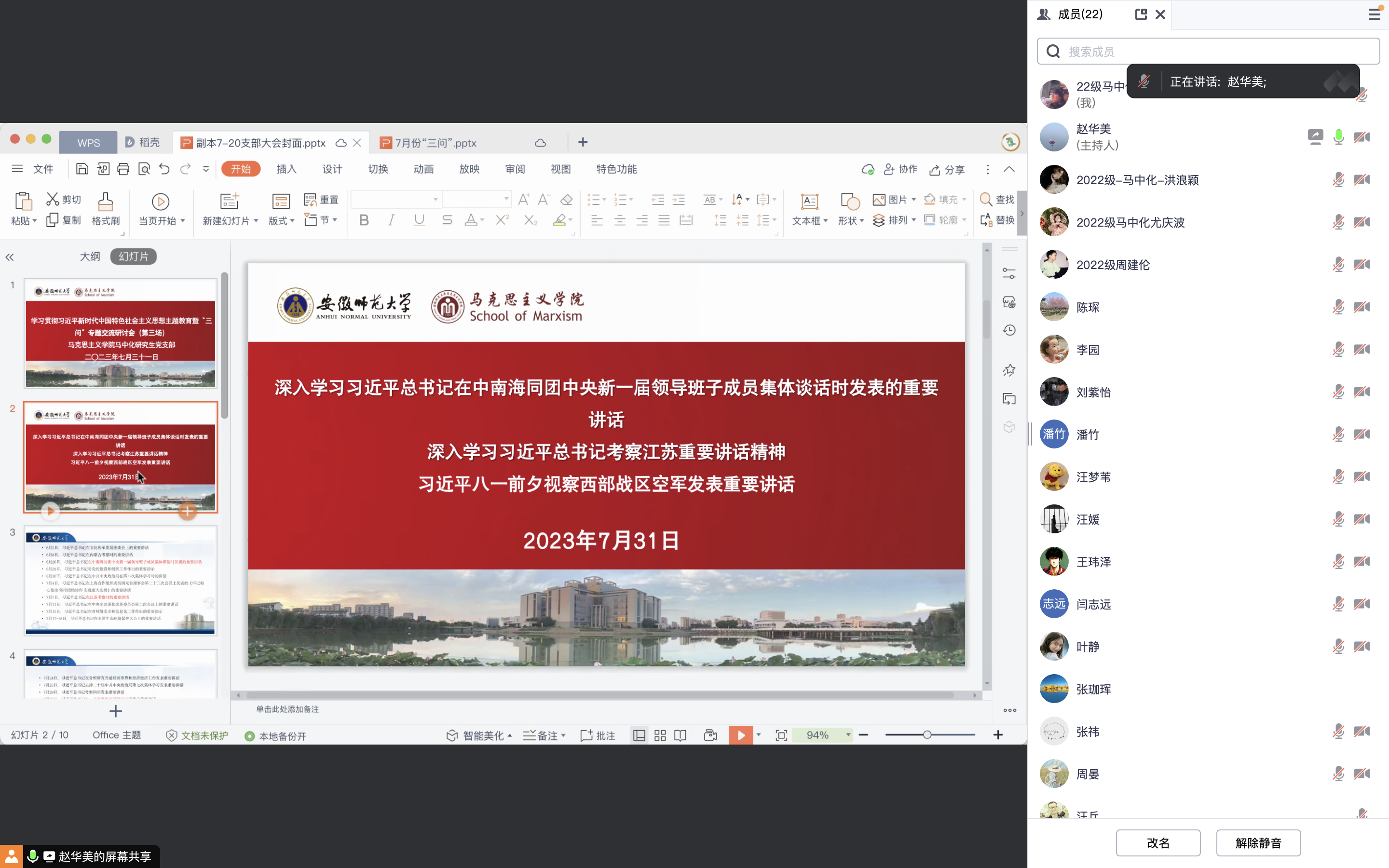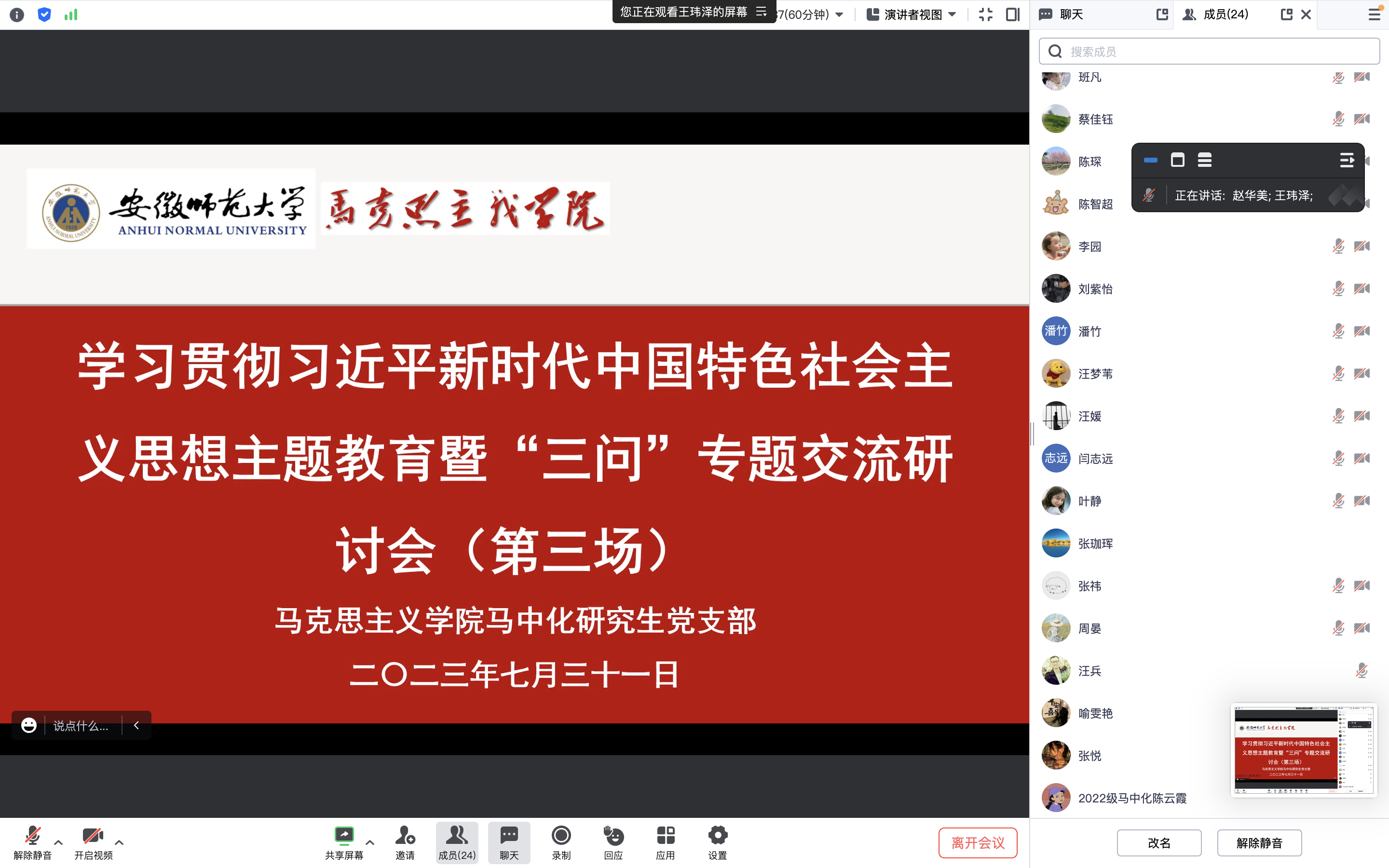 7月31日下午,马中化研究生党支部线上开展学习贯彻习近平新时代中国特色社会主义思想“三问”交流研讨会(第三场)。会议由支部书记赵华美主持,支部全体党员同志参加。