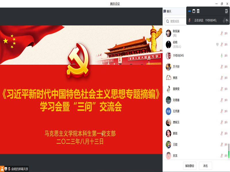 8月13日晚,永利集团304am本科生第一党支部在腾讯会议开展《习近平新时代中国特色社会主义思想专题摘编》学习会暨“三问”交流会。此次活动由俞晓同学主持。
