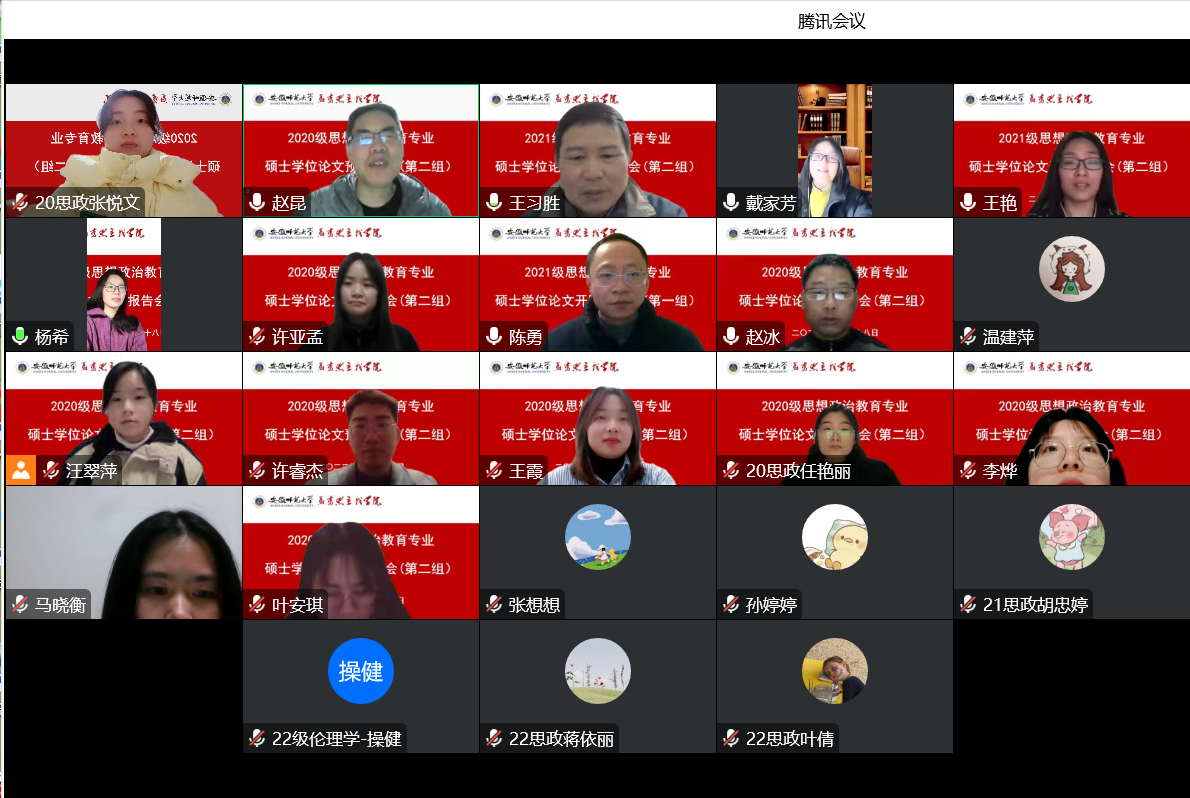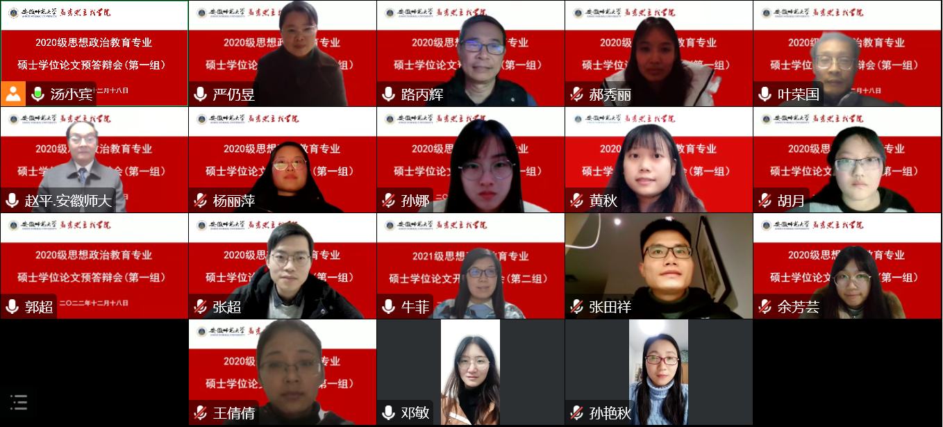 本网讯(2020级研究生 张超)12月18日下午,永利集团304am思想政治教育硕士点2020级思想政治教育专业硕士研究生毕业论文预答辩会顺利举行,会议使用腾讯会议线上方式分两组同时进行。第一组由安庆师范大学严仍昱教授担任预答辩委员会主席,路丙辉教授、赵平教授、叶荣国副教授、牛菲副教授、孙艳秋副教授、郭超副教授、朱琳副教授担任答辩委员。第二组由曲阜师范大学赵昆教授担任预答辩委员会主席,王习胜教授、王艳教授、戴家芳教授、赵冰副教授、杨希副教授、陈勇副教授担任答辩委员。学位点2021级、2022级全体研究生线上观摩学习。