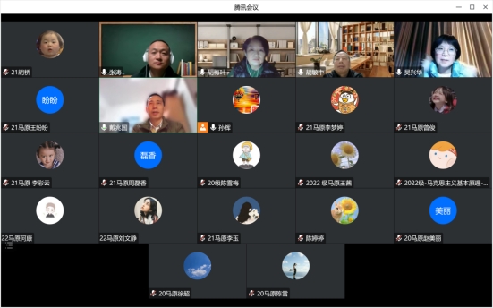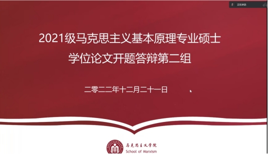 (本网讯)2022年12月21日晚上19:00,我院2021级马克思主义基本原理方向硕士研究生毕业论文开题报告会,以线上的方式分为两组同时进行。北京师范大学胡敏中教授担任第二组答辩主席,学位点导师戴兆国教授、吴兴华教授、张涛副教授、胡梅叶副教授担任答辩委员,学位点讲师孙辉担任答辩秘书,本学位点2020级和2022级研究生全程观摩学习。