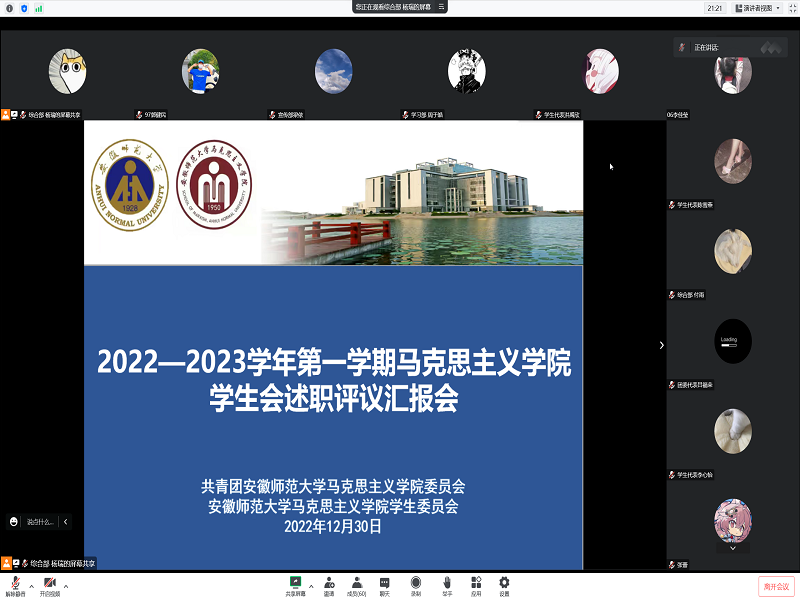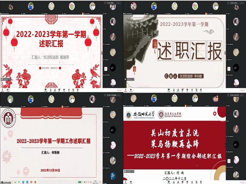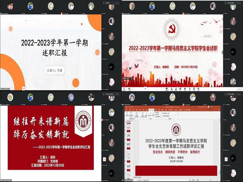 为总结学生会工作,促进新学期任务布置,12月30日下午,学院召开2022-2023学年第一学期永利集团304am学生会述职评议汇报会。学院团委副书记陶娴静、学院研究生会主席团成员张猛、学院研究生会主席团成员韦孟雪、校学生会主席团成员吴佳怡担任评委,永利集团304am团委学生会各部门负责人以及广大学生代表参加会议。本次会议由文体部部员陈楠楠主持。