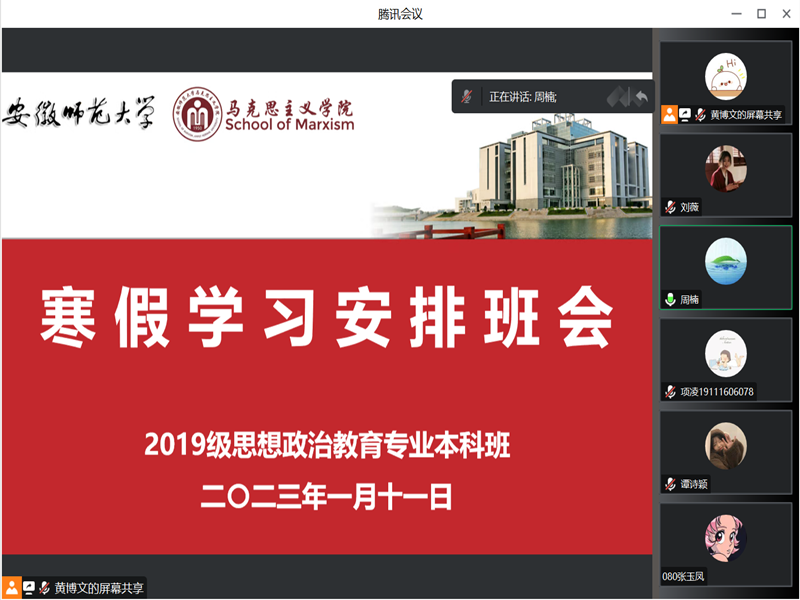 为做好寒假期间对学生学习和生活的有效指导,1月11日下午,19政教寒假学习安排班会依托腾讯会议平台召开,此次班会由辅导员周楠主持,学院19级全体本科生参加。