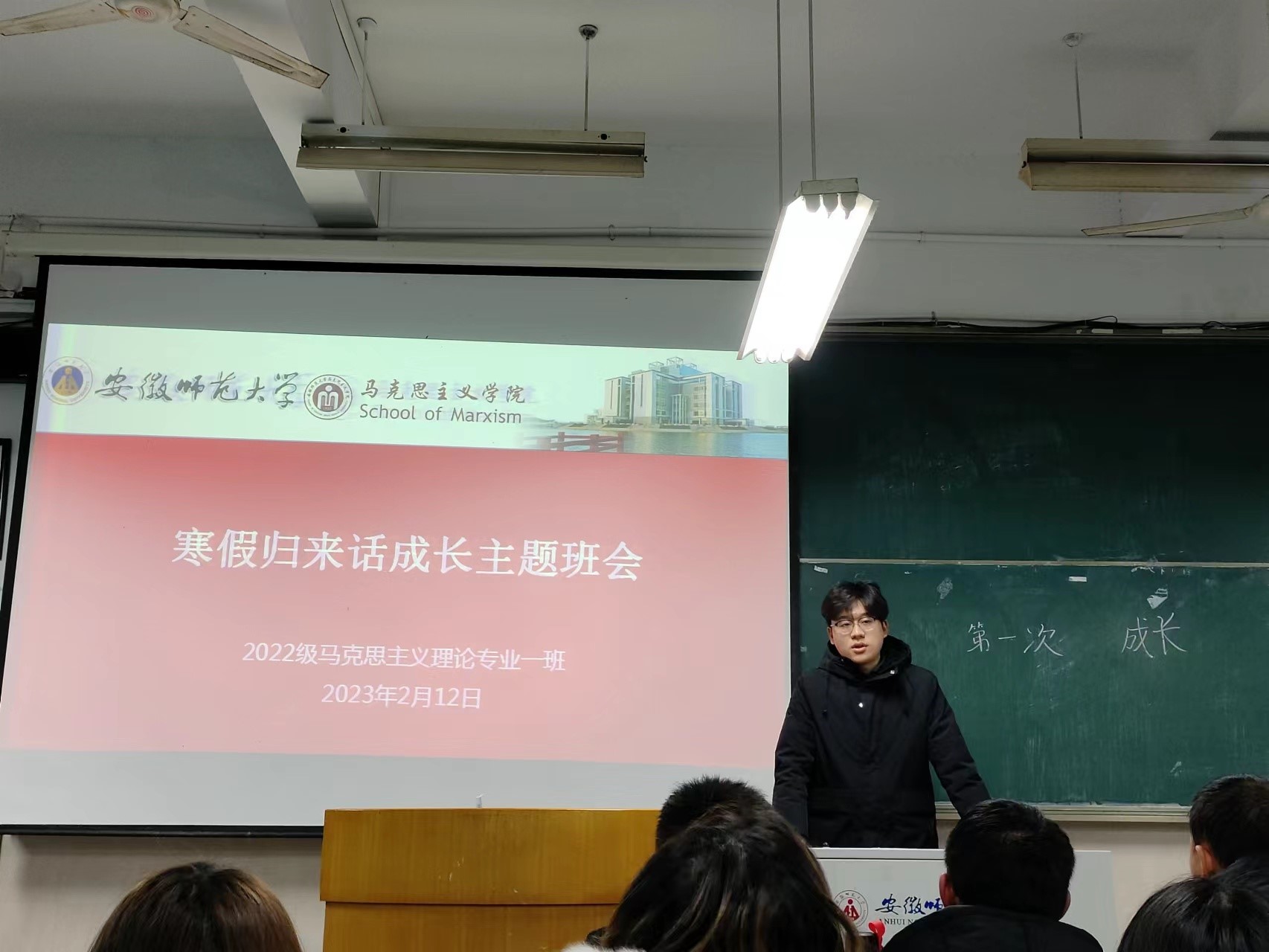 做好分享,座谈承前启后。开学伊始,班级组织寒假归来话成长、开学第一课等主题班会。在开学第一课主题班会上,五位同学分别围绕自己的寒假生活、志愿服务和双创选题等话题,紧密围绕“爱国、团结、奋斗、科学、互助”五个关键词,分享青春践行党的二十大精神、立志成长为新时代好青年的思考与实践故事。分享会后,马克思主义理论专业负责人王子廓老师肯定了五位同学寒假期间所做出的成绩,并寄语同学们向着成为有理想、敢担当、能吃苦、肯奋斗的新时代好青年不断努力奋斗。班会上还布置了考试的相关事宜,通过强调考试纪律不断增强同学们维护马院优良考风考纪的意识。
