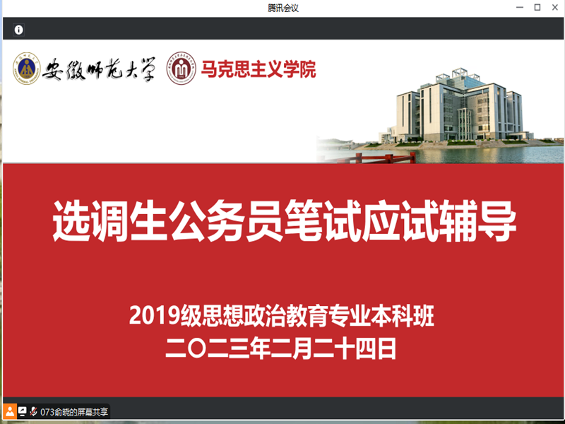 选调生、公务员考试在即,为提高学生笔试应试能力,2月24日,辅导员周楠通过线上腾讯会议的形式开展“选调生公务员应试辅导班会”。报考选调生、公务员的毕业生参加班会。