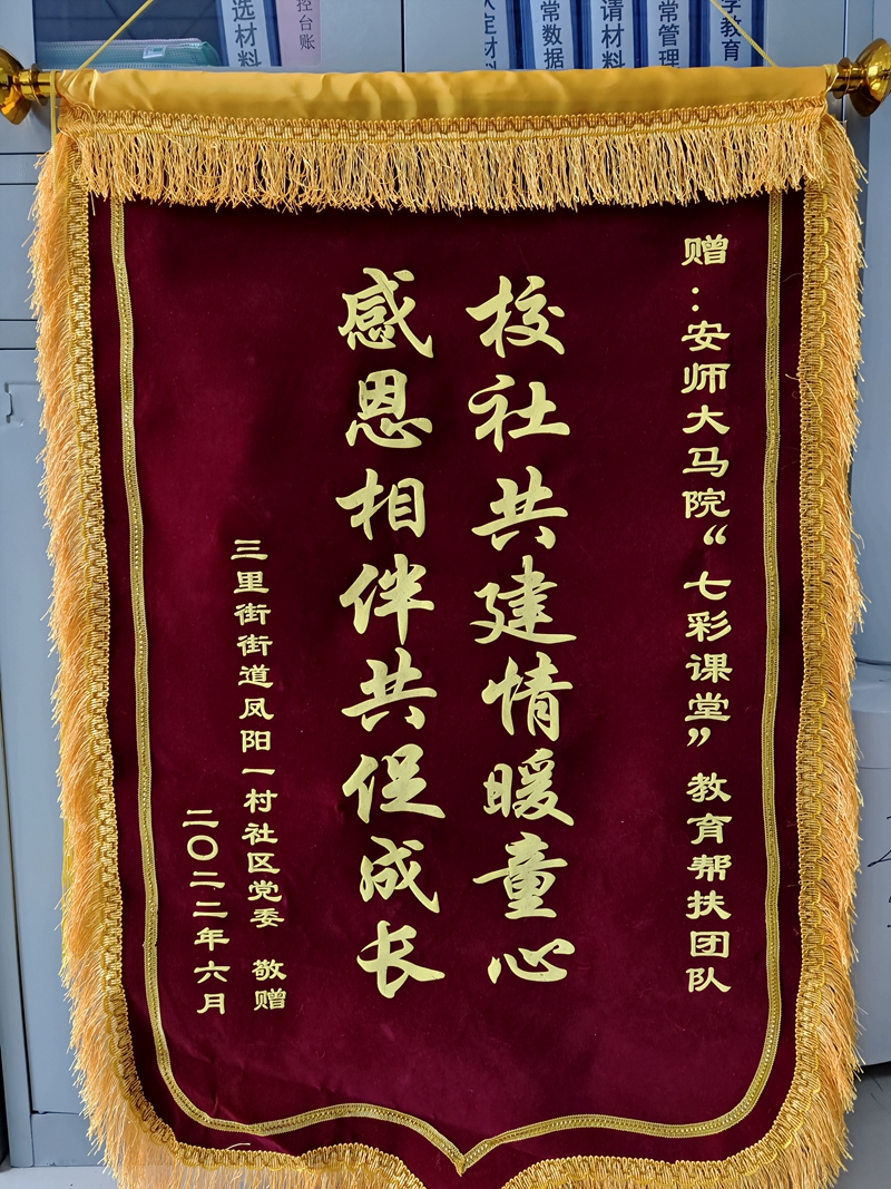 会上,合肥市瑶海区委常委、宣传部长桑宝君对我院长期以来的志愿服务工作给予充分肯定,并对马院学子的辛勤付出和积极参与表示问候和感谢,为学院“七彩课堂”志愿服务队授予锦旗。