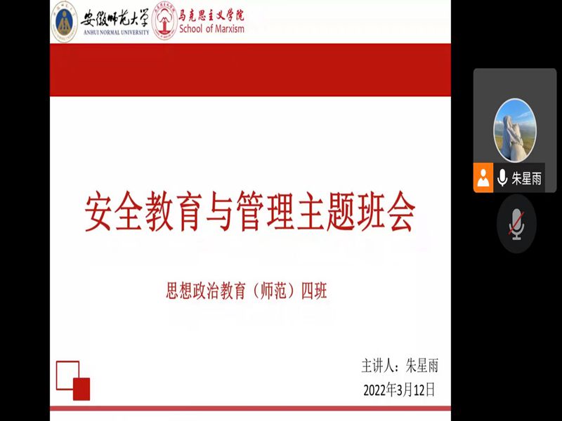 3月12日,2021级思想政治教育专业四班召开线上安全教育主题班会,会议由班级心理委员朱星雨同学主持,2021级思想政治教育专业四班全体同学参与。