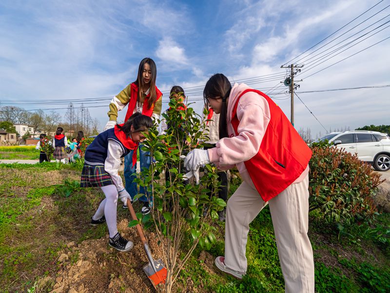在植树现场,采取青年志愿者和少先队员自主结对的方式,现场四人一组,大家纷纷撸起袖子搬运树苗,手持铁铲、挥舞锄头、塘边打水,一起放苗、扶正、培土、培土围堰、浇水,齐心栽下一棵棵树苗,现场一片忙碌的劳动景象。种植后的茶花树迎风挺立,为春光明媚的三月增添了一份活力。
