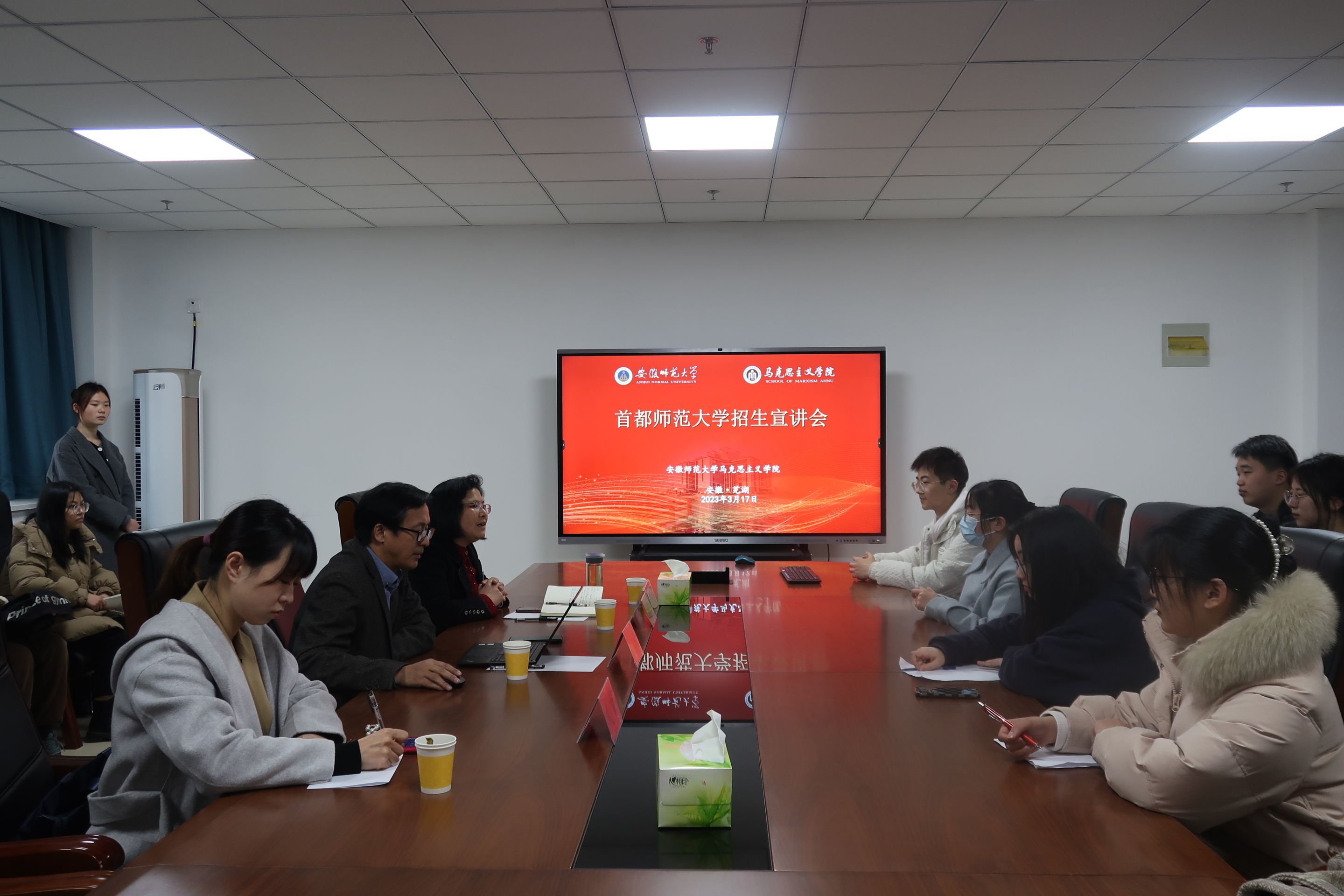 会议伊始,汪盛玉老师对于前来开展招生宣讲工作的两位老师进行了介绍,同学们以热烈的掌声欢迎老师们的到来。随后,沈永福教授对该院的基本情况做了详细的介绍,首师大是处于教育重镇的学科高地,具有广阔的发展前景,其具有雄厚的永利集团、成果卓著的科研实力,在人才培养方面硕果累累。沈永福老师谈到:“师大马院学子专业基础扎实,在一众高校中有口皆碑,我们很欢迎同学们前来报考并提供力所能及的帮助。”他还鼓励同学们继续发扬师大学子拼搏进取的精神,继续深造,为马克思主义理论研究做出贡献。最后,同学们就考研报考的具体问题与二位老师进行了热烈的交谈,老师们针对同学们的疑问一一做了耐心的解答。