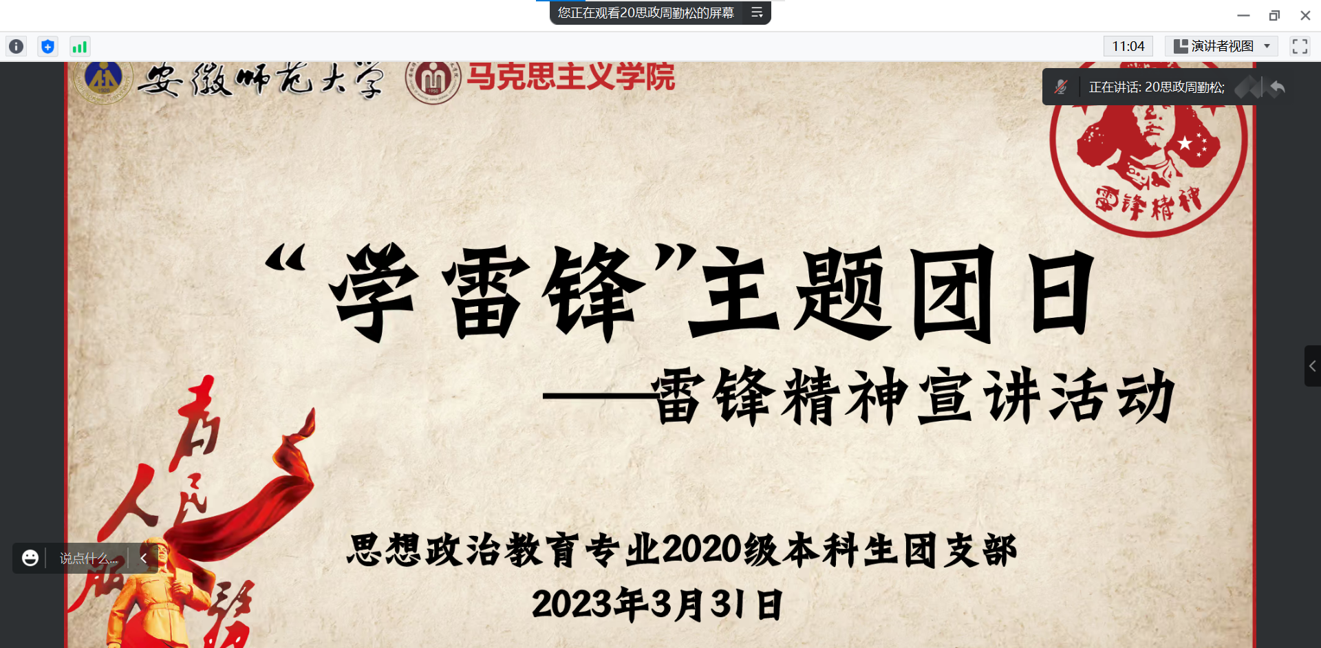 为深刻理解新时代雷锋精神内涵,弘扬雷锋精神,学院思想政治教育专业2020级本科生团支部于3月31日19:30在腾讯会议召开“学雷锋”主题团日活动。本次主题团日活动由团支书周勤松主持,两位团支书依次进行宣讲。