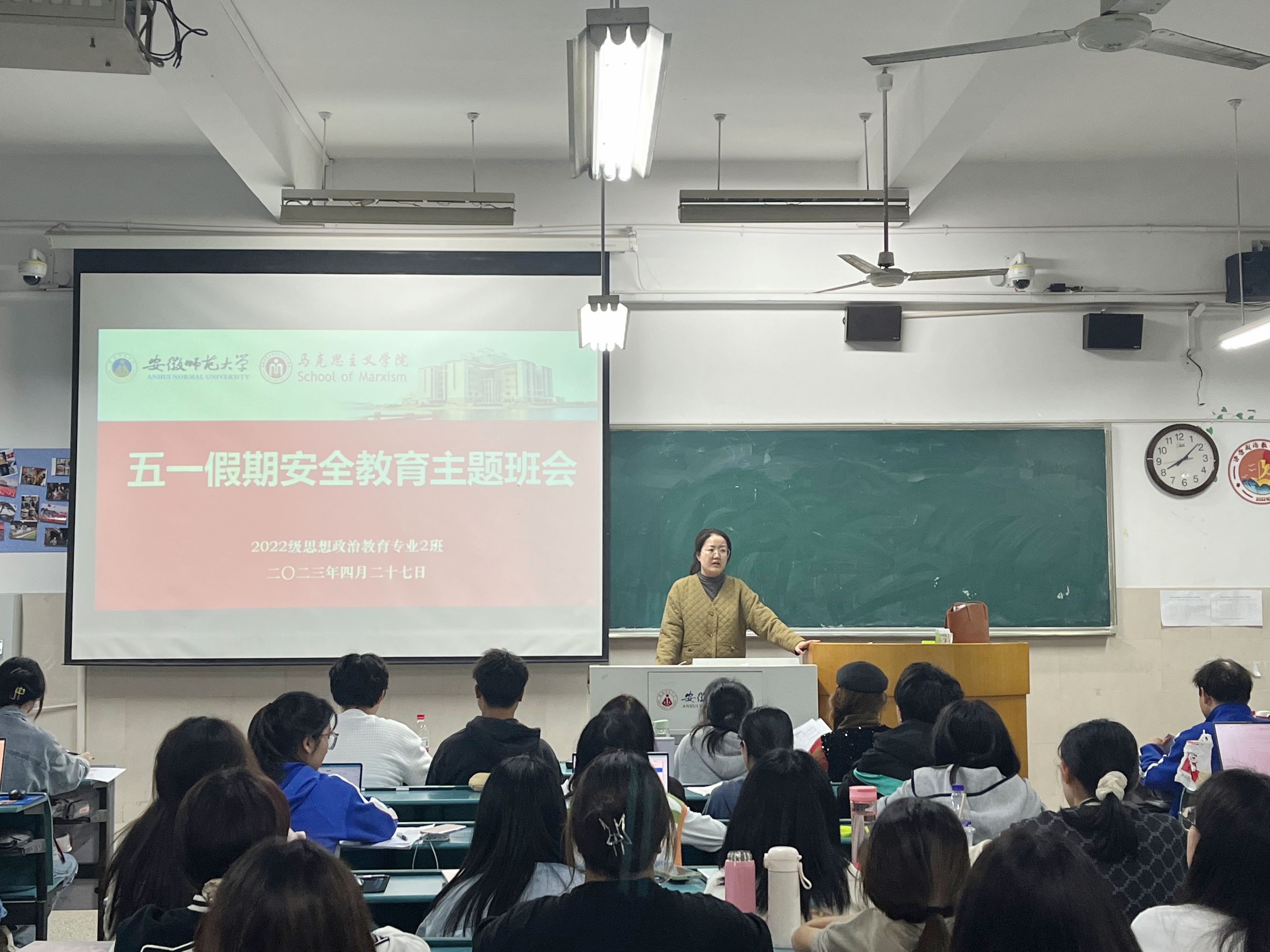 为强化假期安全教育,提高同学们的安全和文明意识,4月27日晚,学院2022级思想政治教育专业在行知楼2020404、2020405教室开展五一假期安全教育主题班会,会议由辅导员陶娴静主持,全体同学参加。