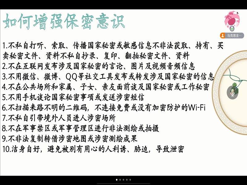 活动开始,黄婉清首先通过一段视频向大家展示了在日常生活中经常发生的一些十分危险的泄密情况,引发了在场同学的积极讨论和自我反思。接着,她通过PPT展示,从保密工作的定义,严格把握保密工作的重要性两个方面对保密工作进行了具体阐释,提高同学们积极了解保密知识的主动性。同时,她向同学们展示公安部列举的十条有关保密的建议,要求同学们在日常生活中要自觉增强保密意识,保持高度的政治敏感性和责任感。