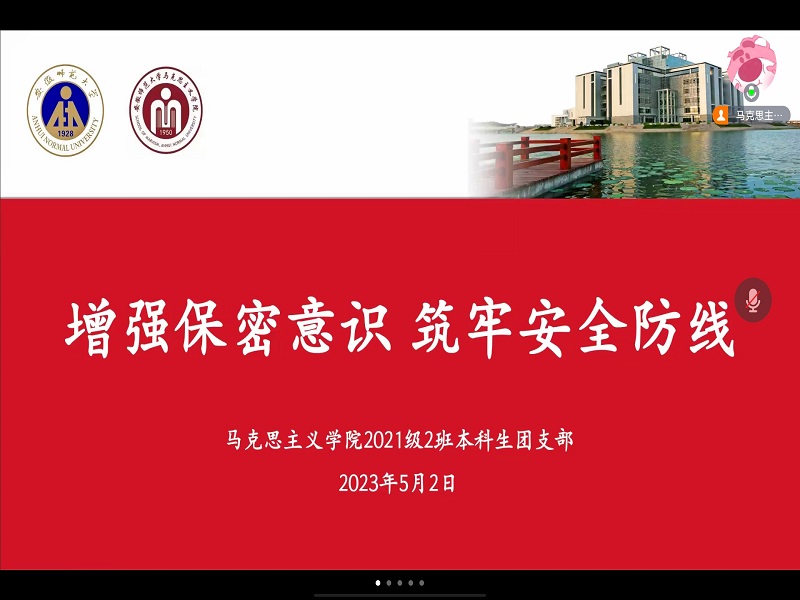 5月2日晚,2021级思想政治教育专业教学一班在线上开展“增强保密意识,筑牢安全防线”主题团日活动。本次团日活动由团支书黄婉清主持,教学一班全体同学参加会议。