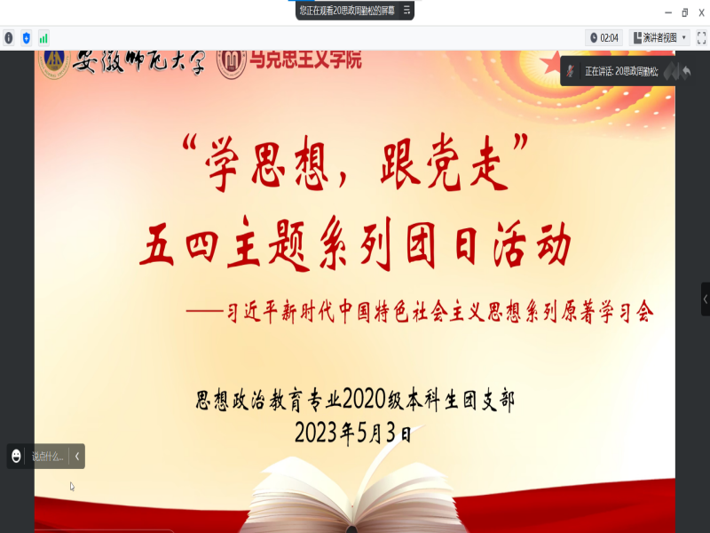 红色书籍引领成长。2020级思政本科生团支部书记周勤松向同学们推荐了六部著作,杨占婕进行重点书目讲解,加深同学们对习近平新时代中国特色社会主义思想的了解。在2022级马克思主义理论团支部集中观看了新闻联播,了解了学习贯彻习近平新时代中国特色社会主义思想主题教育的基本情况。2022级思政专业开展红色经典读书分享会,重温党的峥嵘岁月,坚定永远跟党走的理想信念。