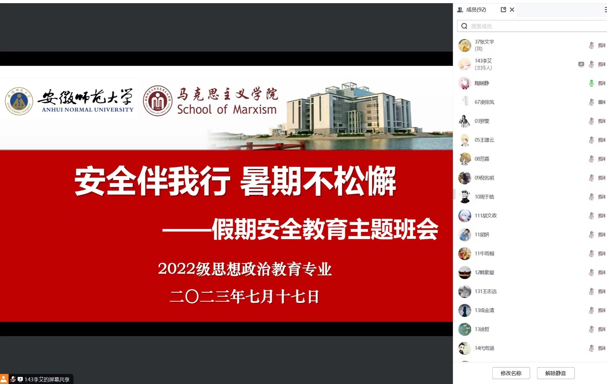 为培养学生安全意识,守护学生假期安全,7月17日晚,2022级思想政治教育专业通过腾讯会议开展“安全伴我行,暑期不松懈”假期安全教育主题班会,此次班会由辅导员陶娴静主持,全体同学参加。