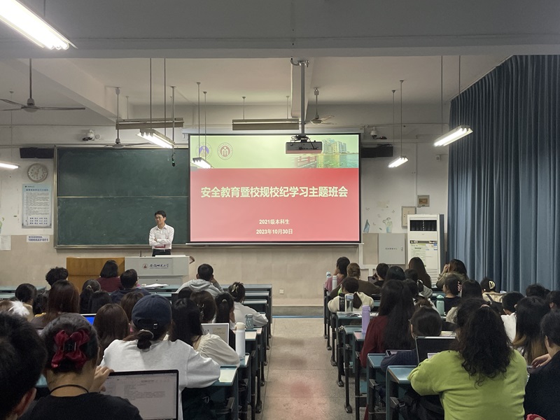 10月30日晚,2021级思想政治教育专业教学1班在2020203教室组织召开“安全教育暨校规校纪学习”主题班会,全体同学参加会议,辅导员沈镇主持会议。