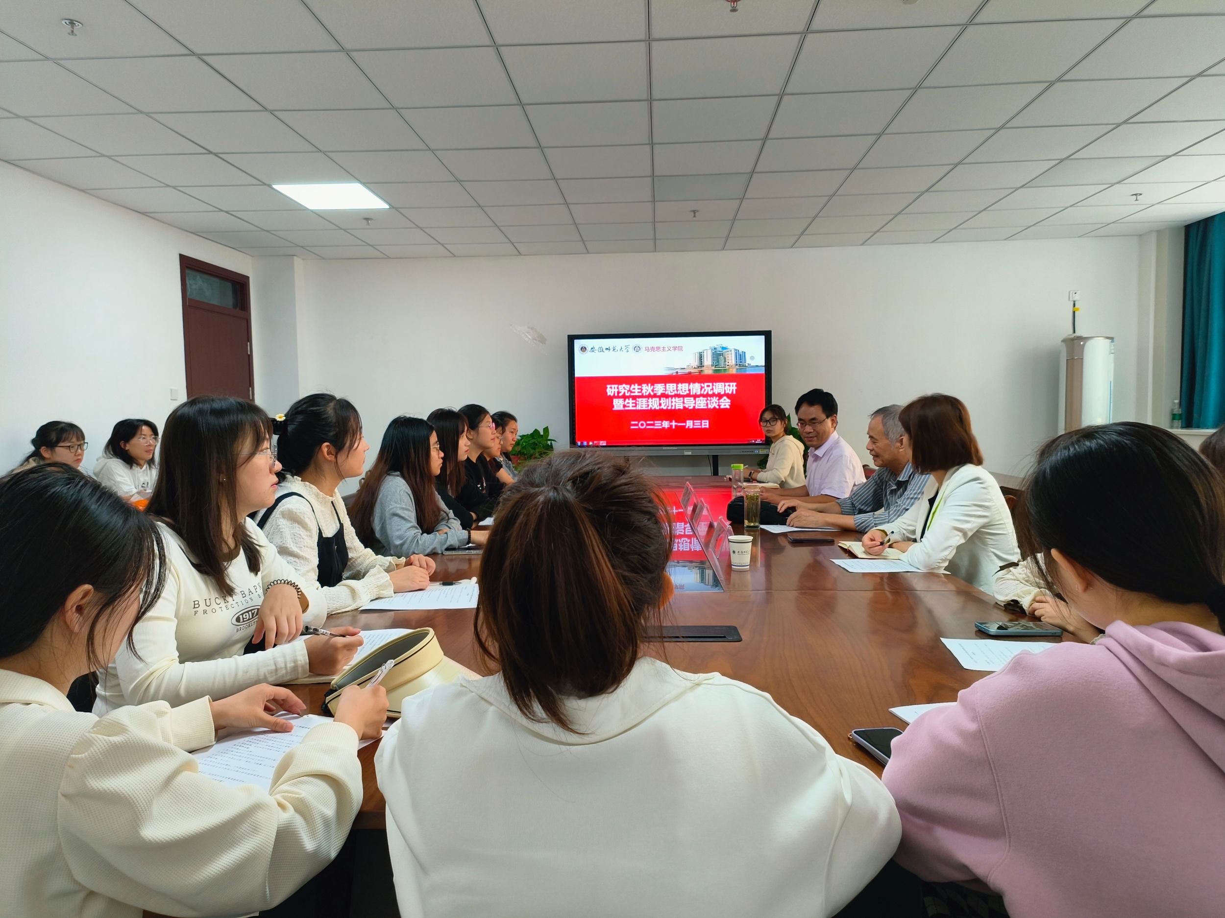 为帮助新生解决入学以来面临的学习困惑,11月3日下午,永利集团304am在研究生党支部会议室召开研究生秋季思想情况调研暨生涯规划指导座谈会。本次座谈会由学院关工委常务副主任李廷宪教授主讲,学院党委副书记刘玉艳、2023级思想政治教育方向的硕士生参加会议,座谈会由辅导员周楠主持。