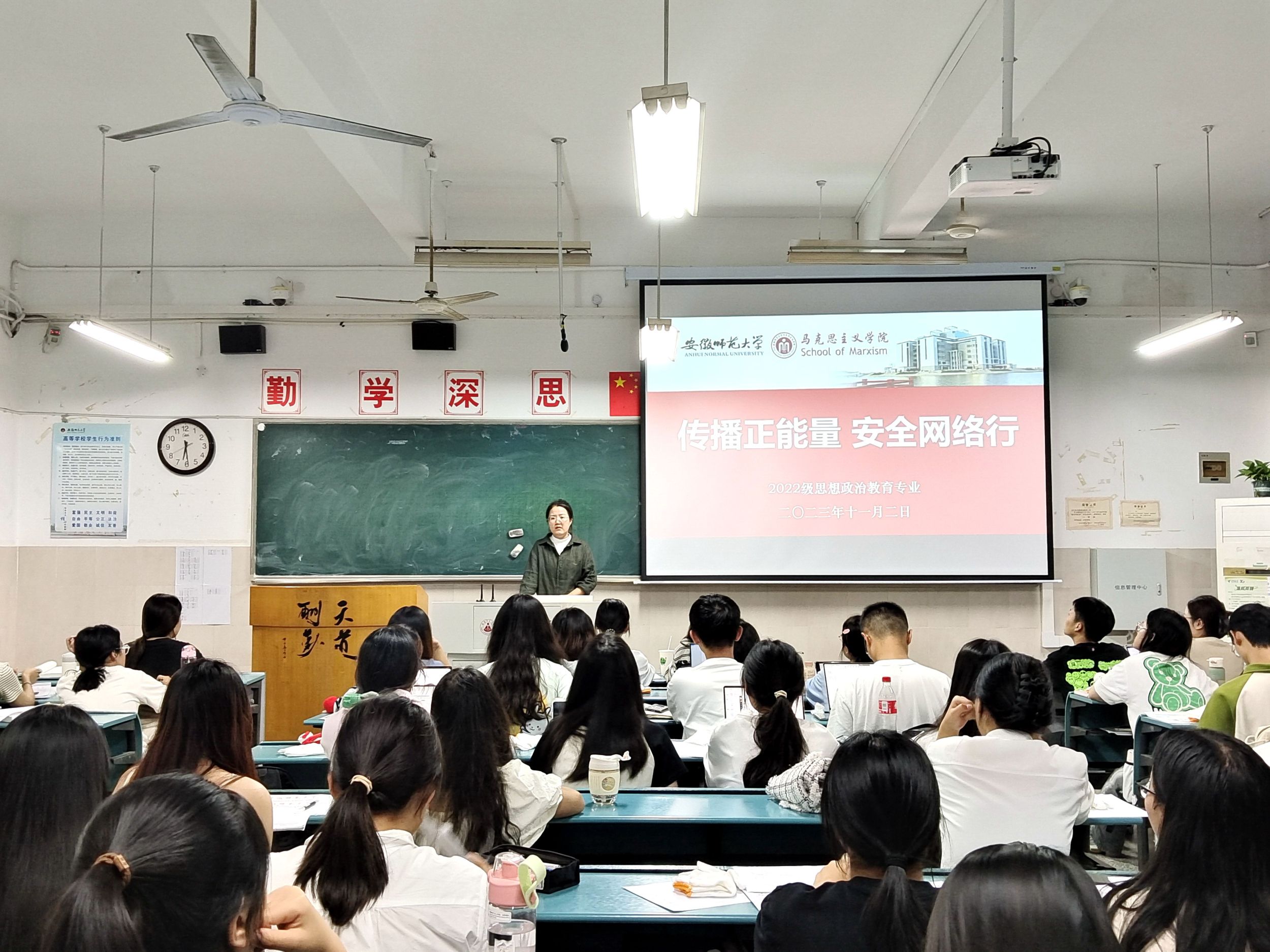 为提高大学生网络安全意识,传播正能量,11月2日晚,2022级思想政治教育专业在行知楼2020405、2020404教室开展“传播正能量,安全网络行”主题班会,会议由辅导员陶娴静主持,全体同学参加。