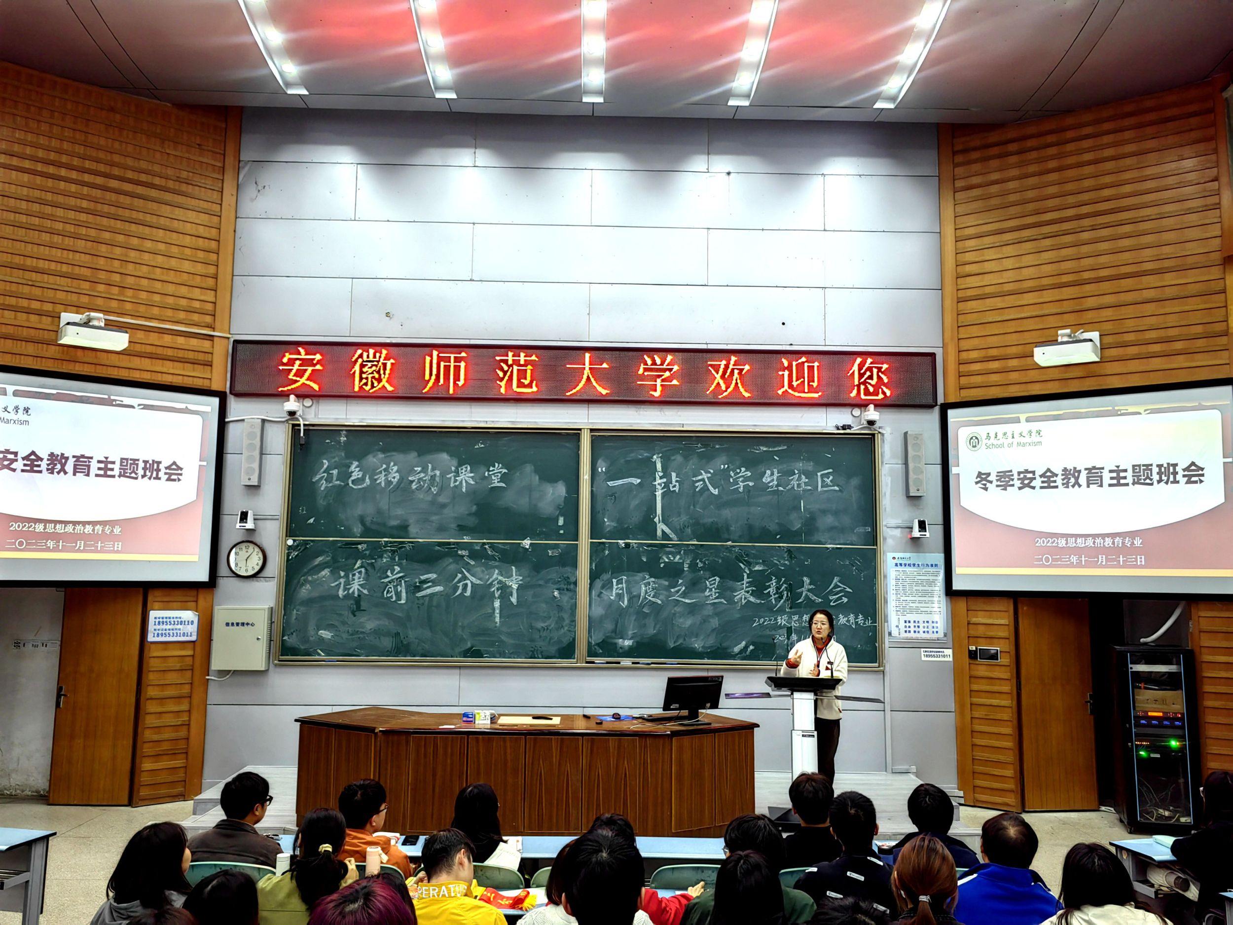 为进一步强化学生安全防范意识、规范学生安全行为,11月23日晚,学院2022级思想政治教育专业在行知楼2010105教室开展冬季安全教育主题班会,会议由辅导员陶娴静主持,全体同学参加。