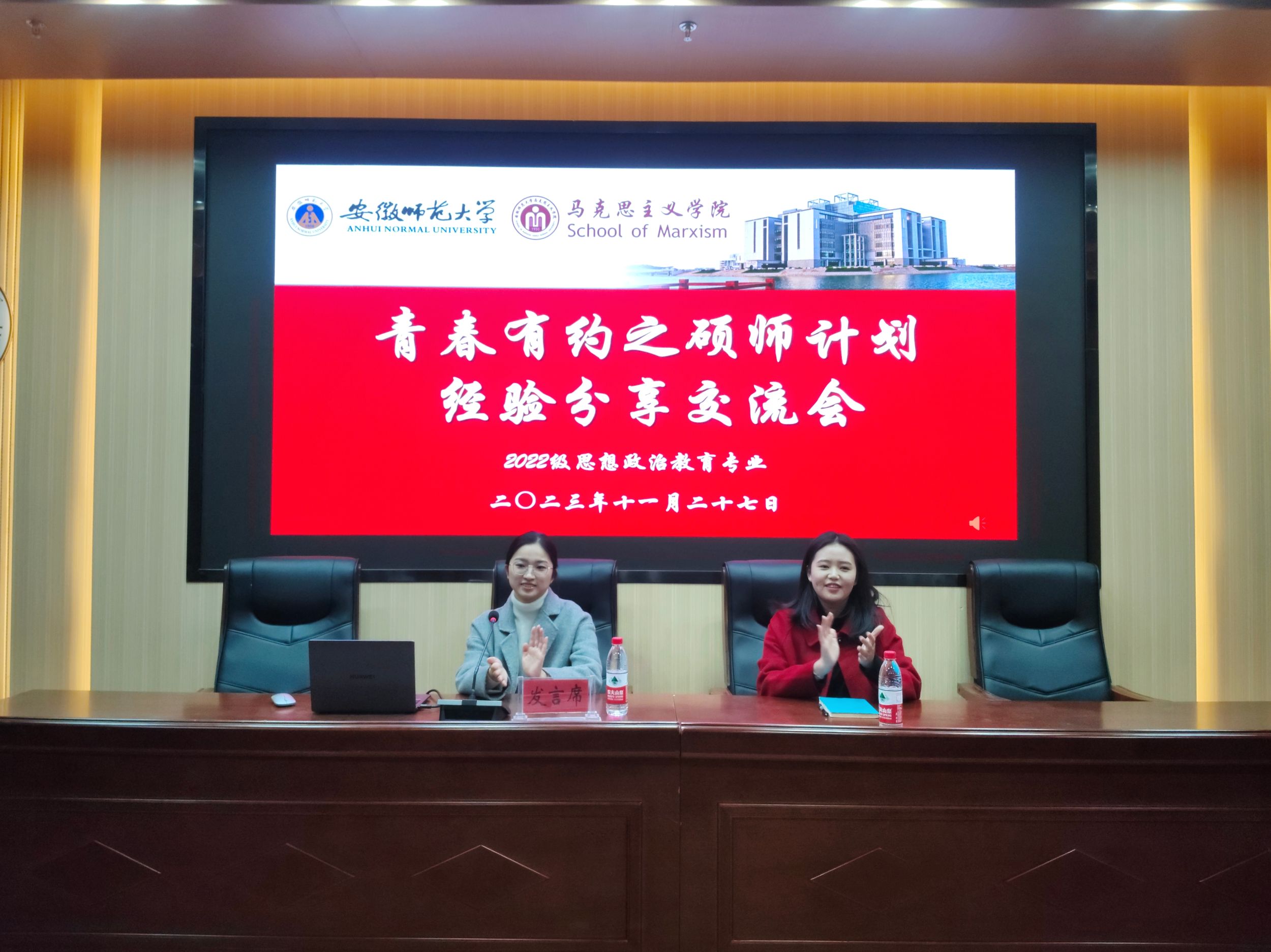 11月27日晚,学院2022级思想政治教育专业在文典楼G108会议室开展青春有约之硕师计划经验分享交流会,2020级本科生乔婷婷、孙迅应邀主讲,会议由团支书倪名明主持。