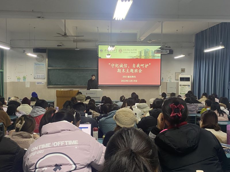 为提高学生安全防范意识,推动期末考试相关工作顺利展开,12月18日下午,2021级本科生在2020203教室召开主题为“守纪诚信,自我呵护”的期末主题班会。本次班会由辅导员沈镇主持,全体同学参会。