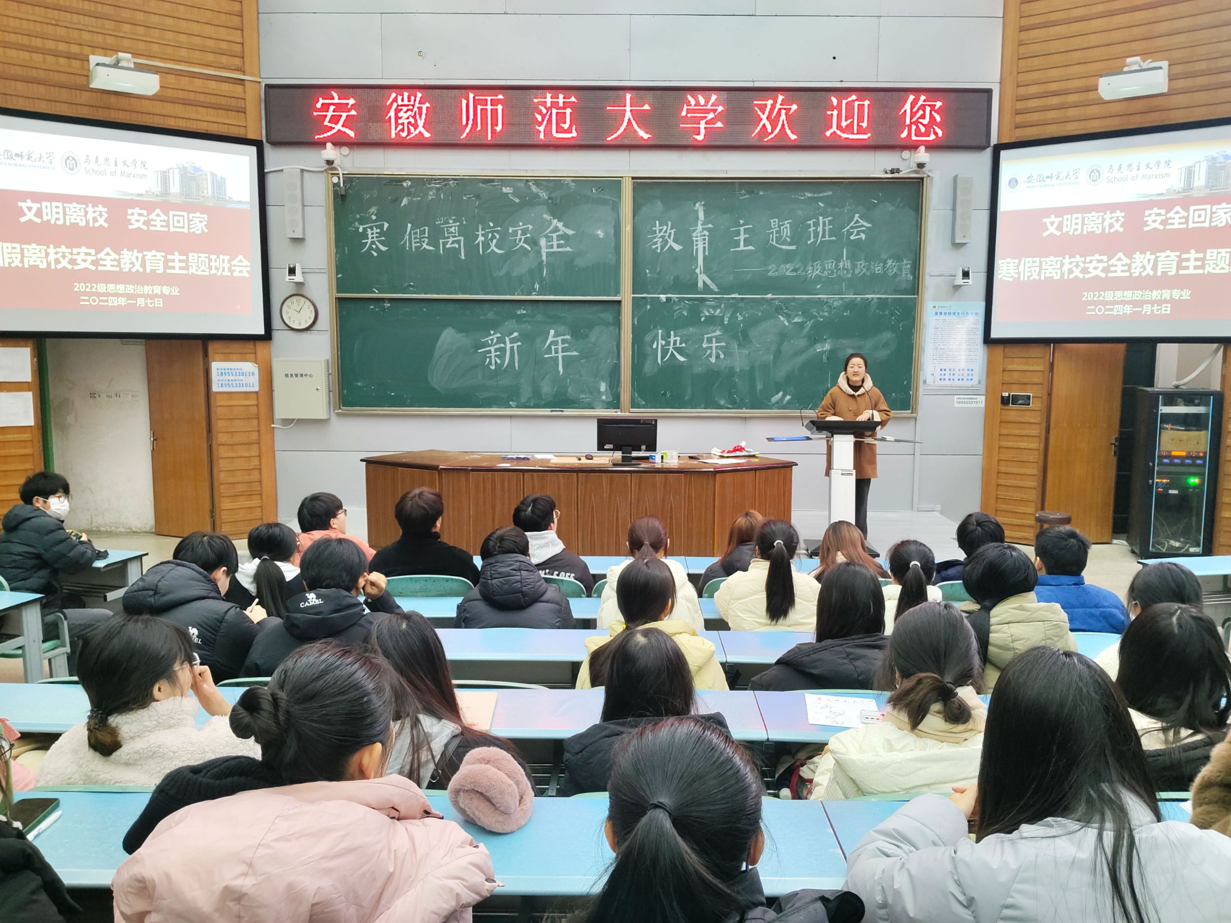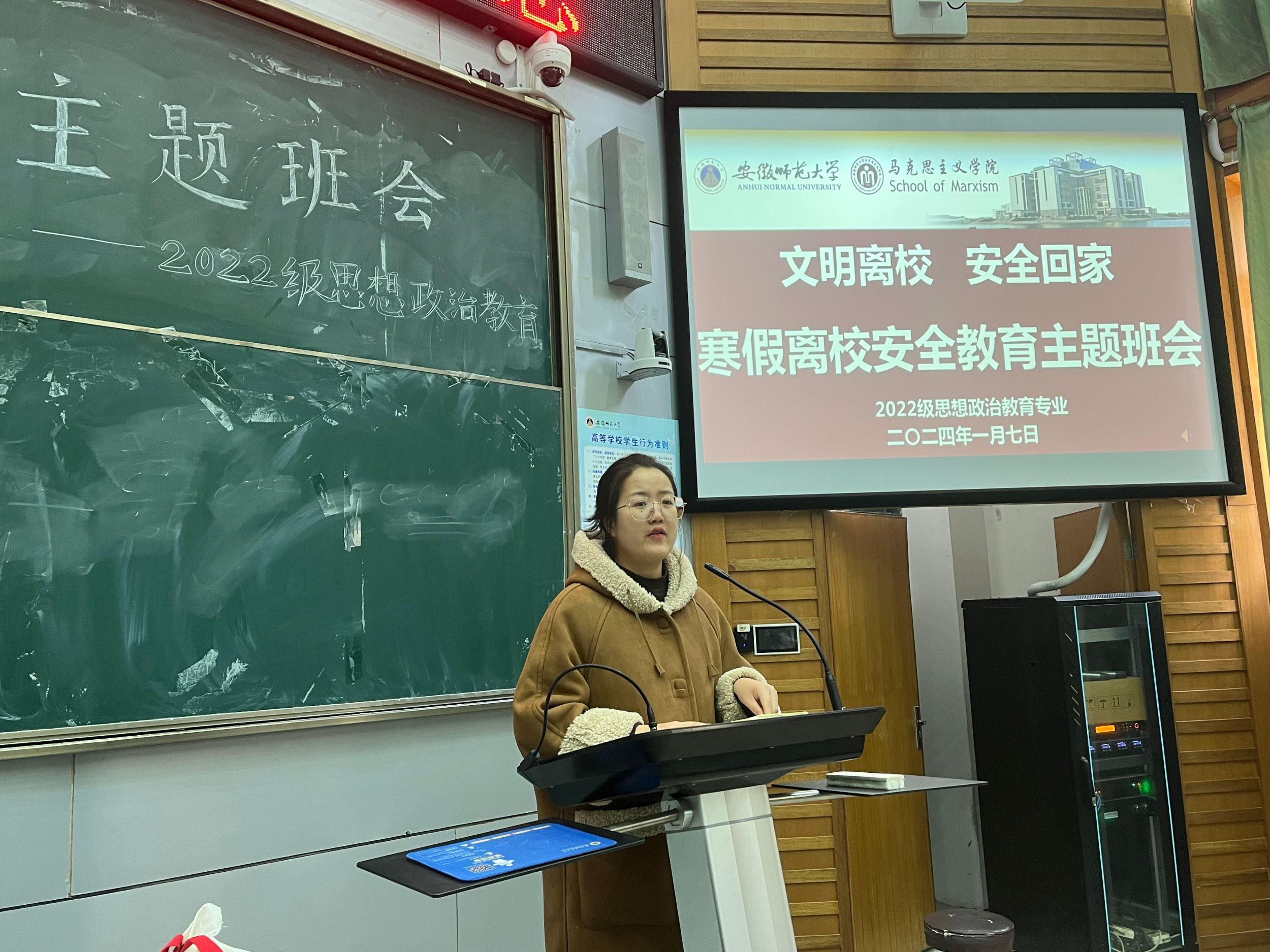 1月7日上午,2022级思想政治教育专业于行知楼2010105教室开展“文明离校,安全回家”寒假离校安全教育主题班会,会议由辅导员陶娴静主持,全体同学参加。