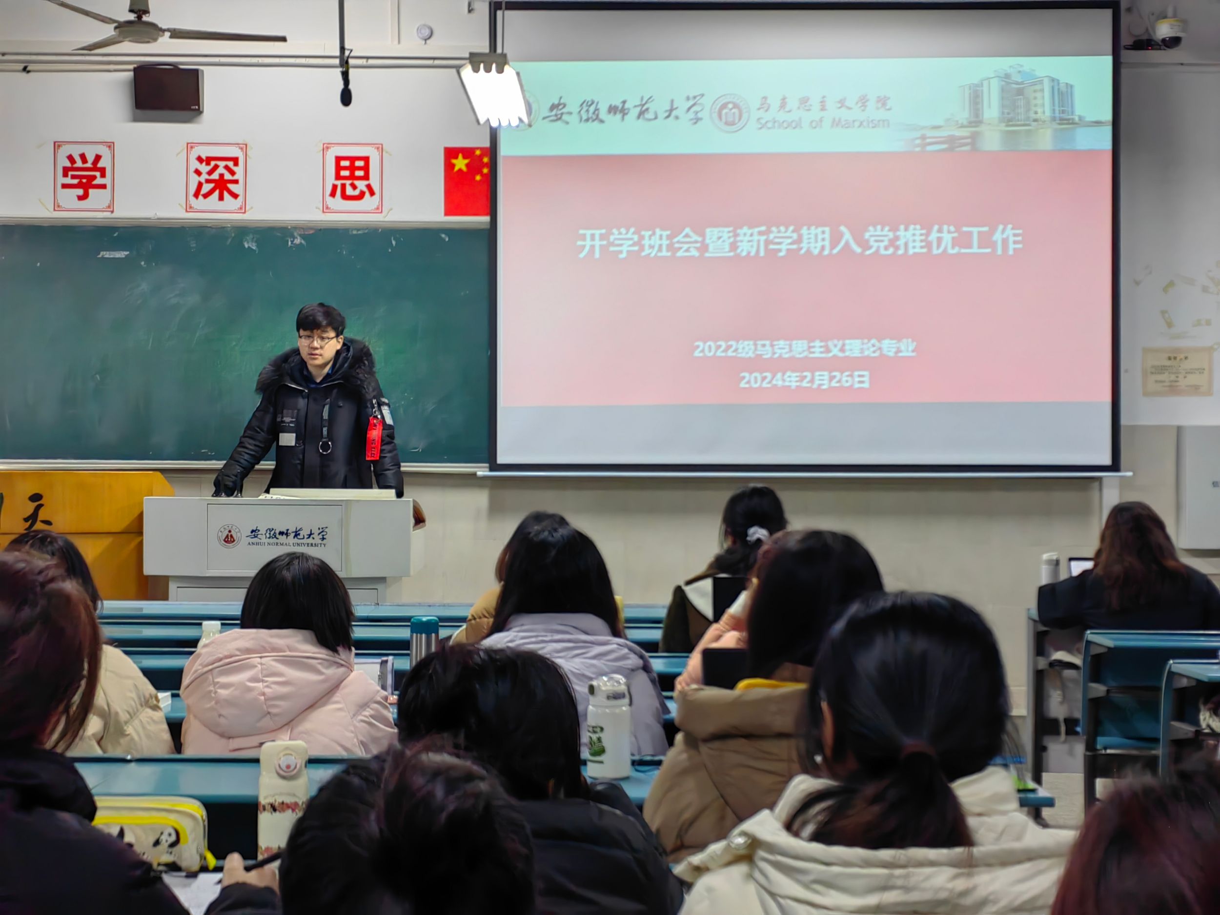 为提高入党积极分子发展质量,2月26日晚,2022级马克思主义理论一班在行知楼2020404教室召开开学班会暨第四批入党积极分子推优会。本次会议由季行健主持,2022级马克思主义理论一班全体团员同学参加。