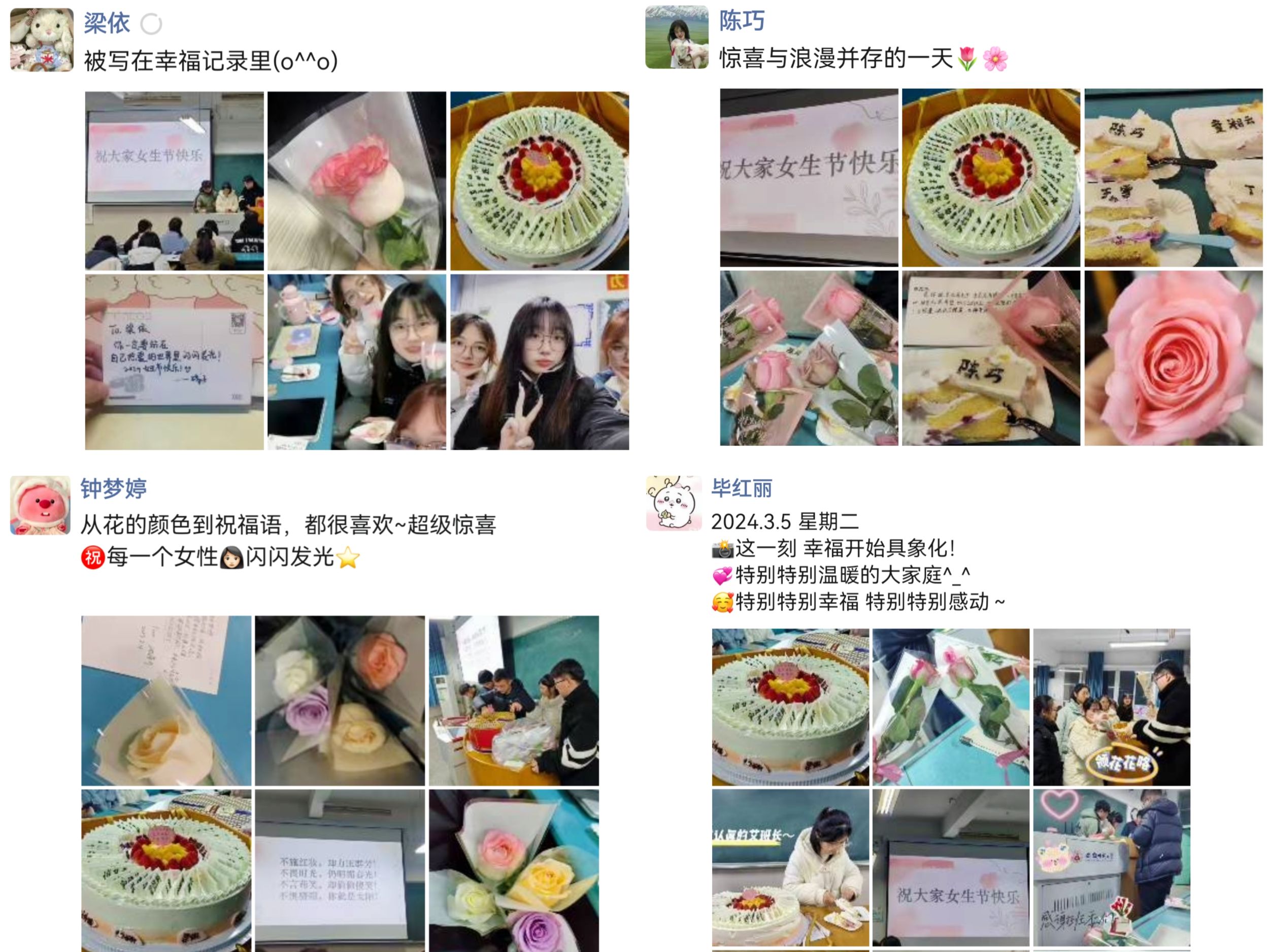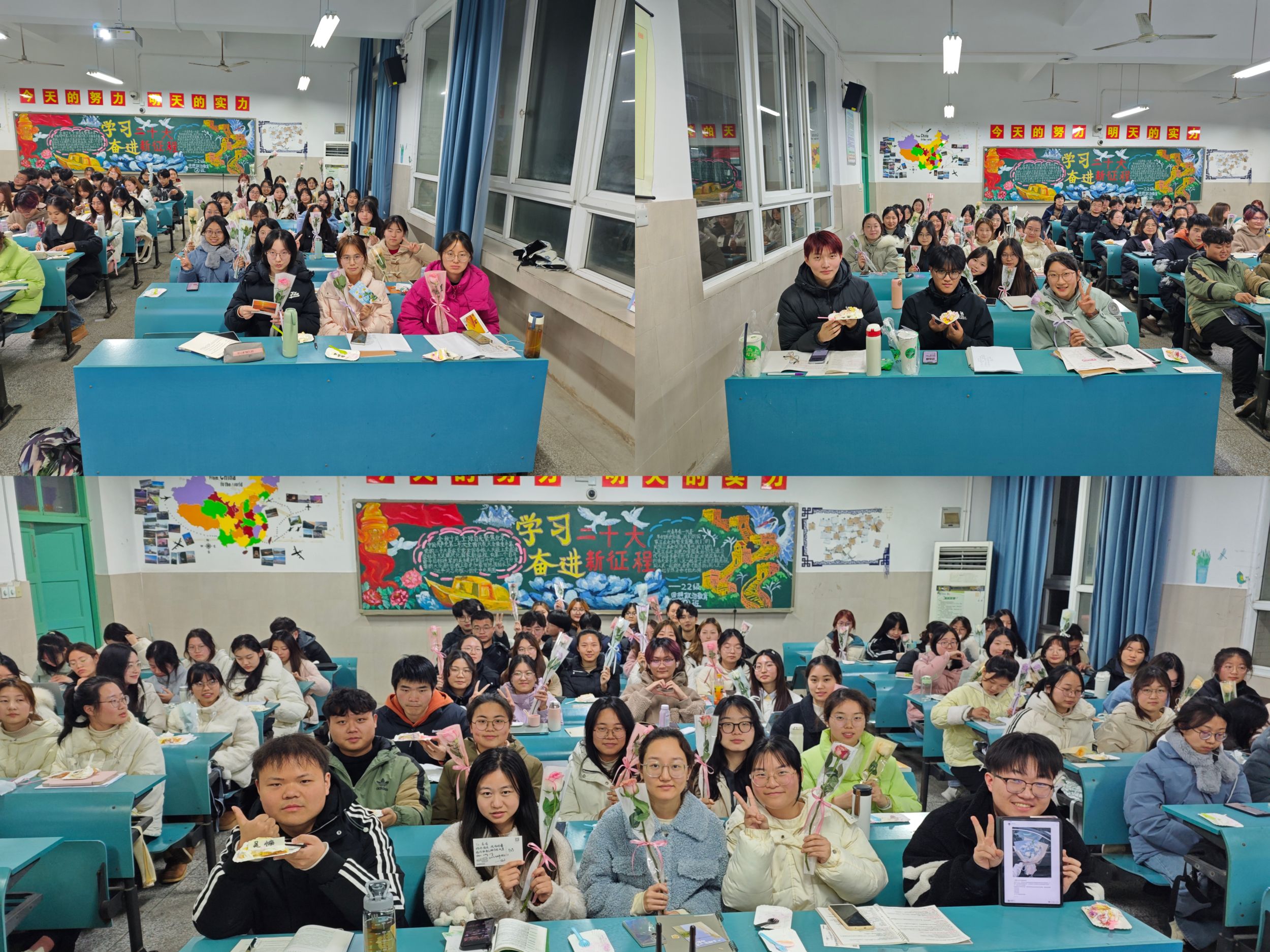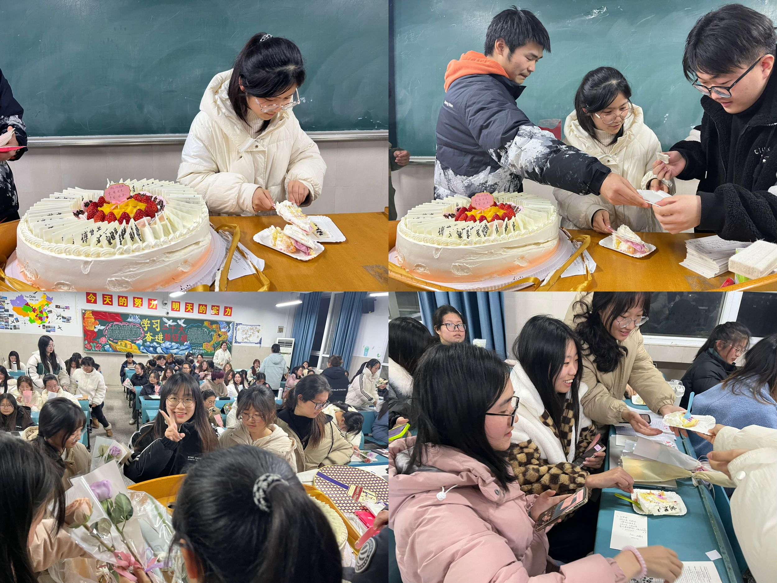 男生班委们将事先为班级女同学写好的贺卡和鲜花传递到每一位女生的手中,小小的贺卡上承载了满满的温情,架起了同学心灵之间的沟通桥梁,温暖了班级里的每一位女生。班委们将写满班级每位同学姓名的大蛋糕依次切分,送至对应的同学手中,同学们在享受美味的同时切实感觉到了班集体大家庭的温馨,希望大家不仅精神面貌如鲜花般饱满,也能在新时代的广阔舞台上绽放芳华,活出属于自己的精彩。