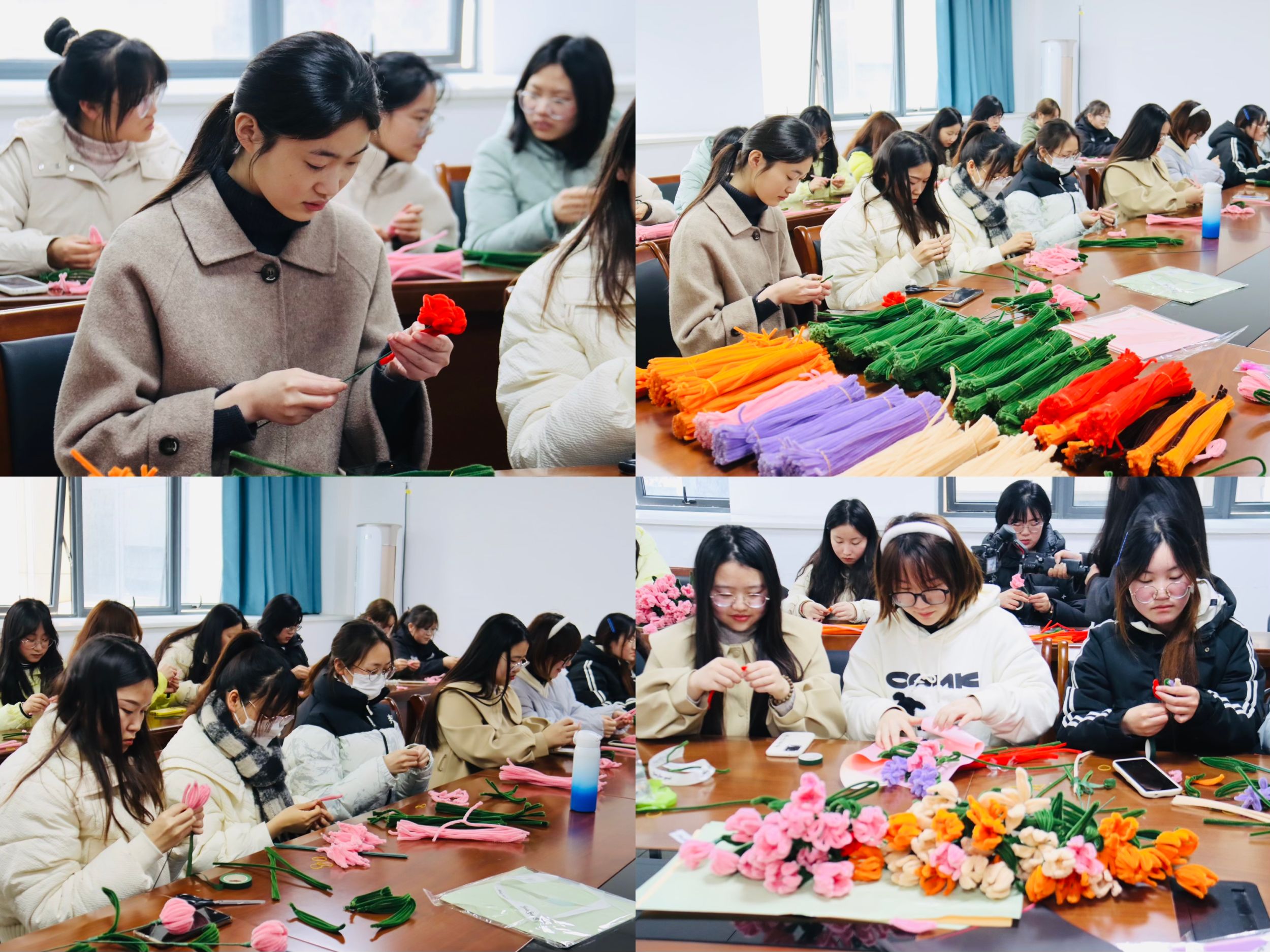 活动前夕,学院团委学生会面向全院集中招募志愿者,学院学子积极参加,主动学习,认真制作,默契配合,将扭扭棒制成花朵,亲手将其包装成为一束束精美的手捧花,50名同学共完成220支花束。