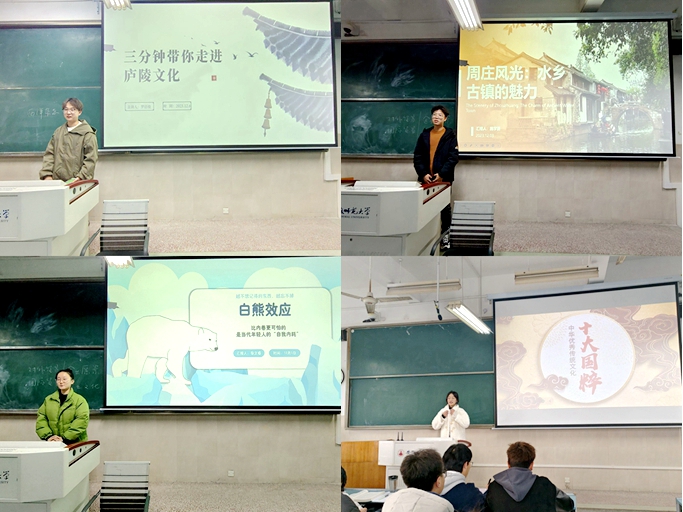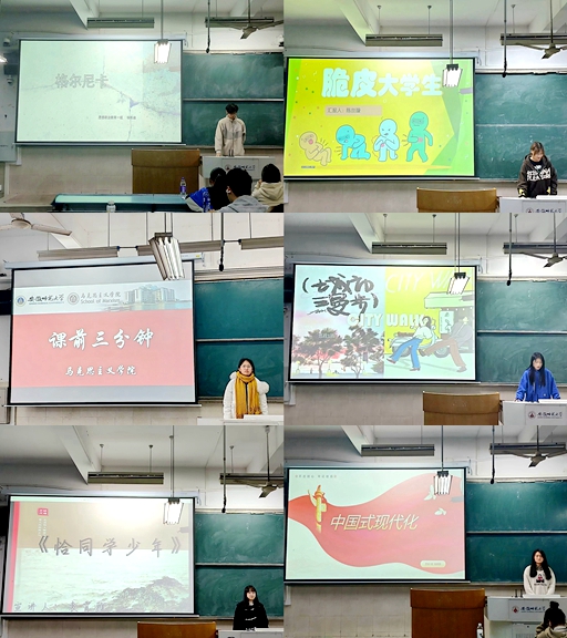 “课前三分钟”要求每位新生在每次课前结合专业特色,准备一段三分钟的演讲,包括新闻时事、学习感受、读书感悟及影视观感等,要求立意新颖、表达清晰、逻辑严谨。这一活动为新生提供了一个展示自我、锻炼能力的平台,同时也促进了班级内部的交流与互动。通过演讲,学生不仅锻炼了语言文字表达能力,还学会了如何选取合适的主题、组织清晰的逻辑、快速有效地制作PPT,还能够帮助师范生克服上台紧张心理、增强自信心、锻炼教学能力。
