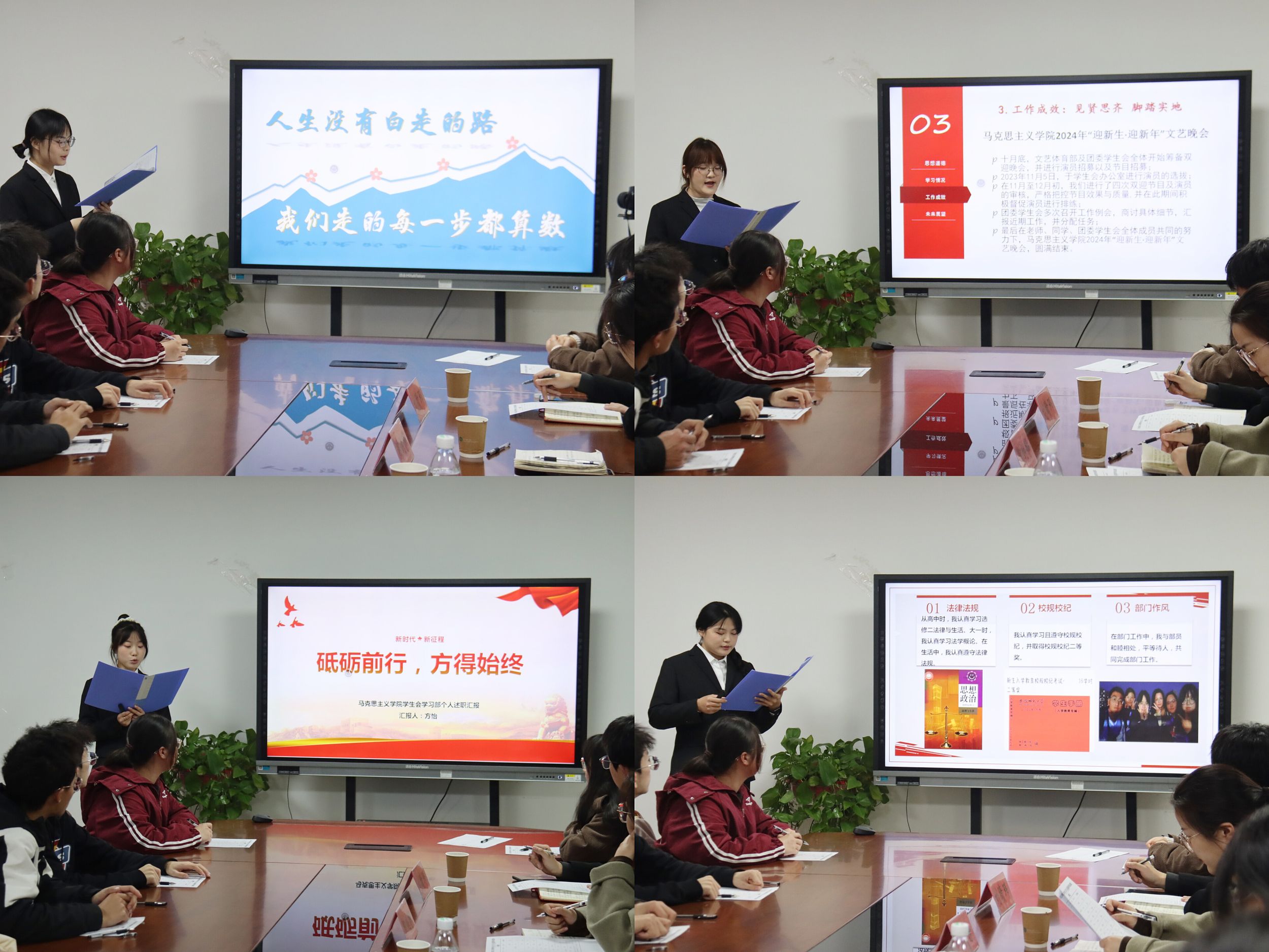 本次述职评议会主要由学院学生会11位部门负责人进行汇报展示。汇报人在总结反思第一学期工作成效的同时,对第二学期的工作进行展望。汇报结束后,陶娴静作总结发言,她对学生会全体工作人员的付出给予充分肯定的同时,指出当前工作中存在的不足,并希望学生会全体工作人员应当充分发挥学生组织联系同学,服务同学的重要作用,把学生会工作做好、做细、做实,真正把学院学生会打造成同学满意、学院信赖的成长服务组织。