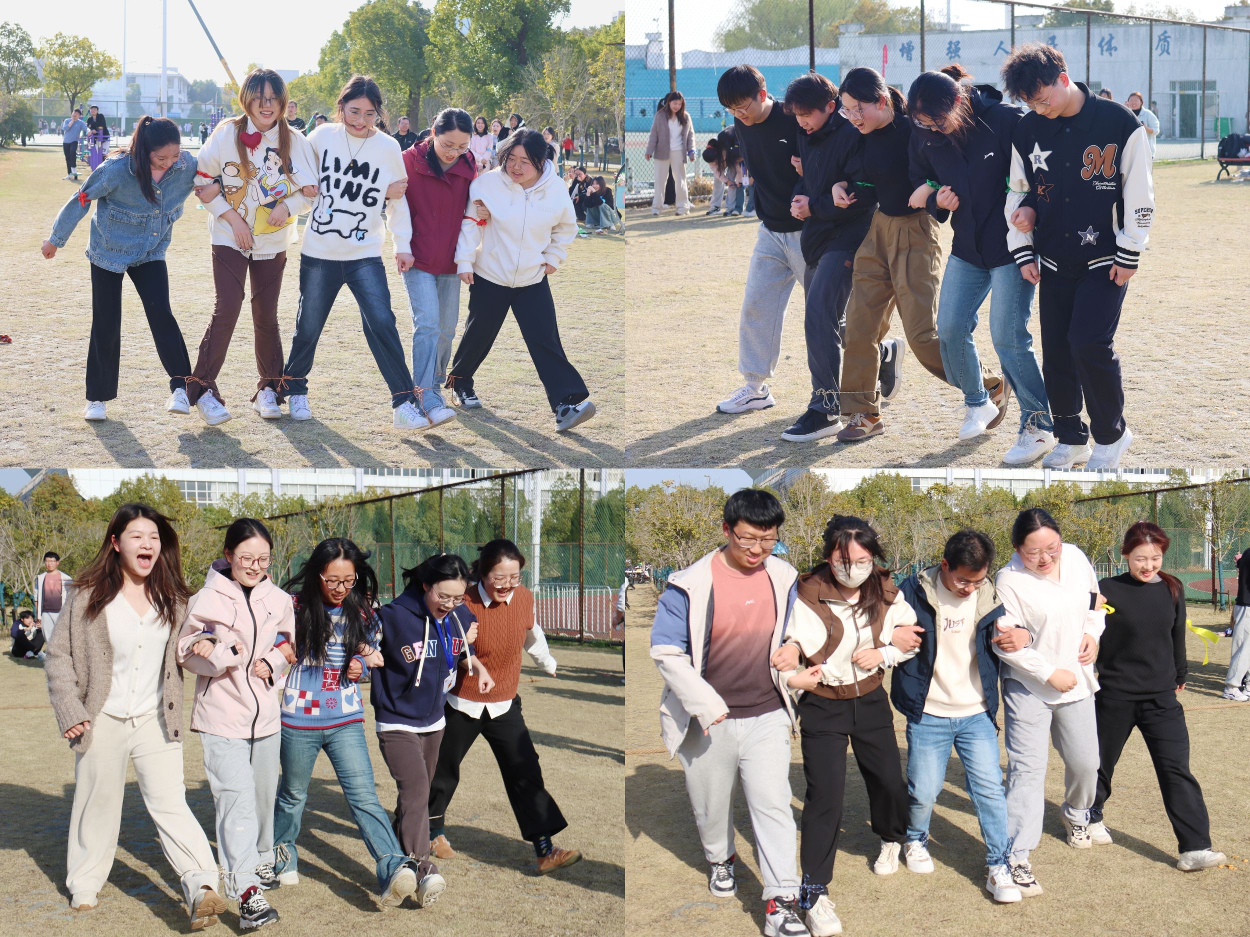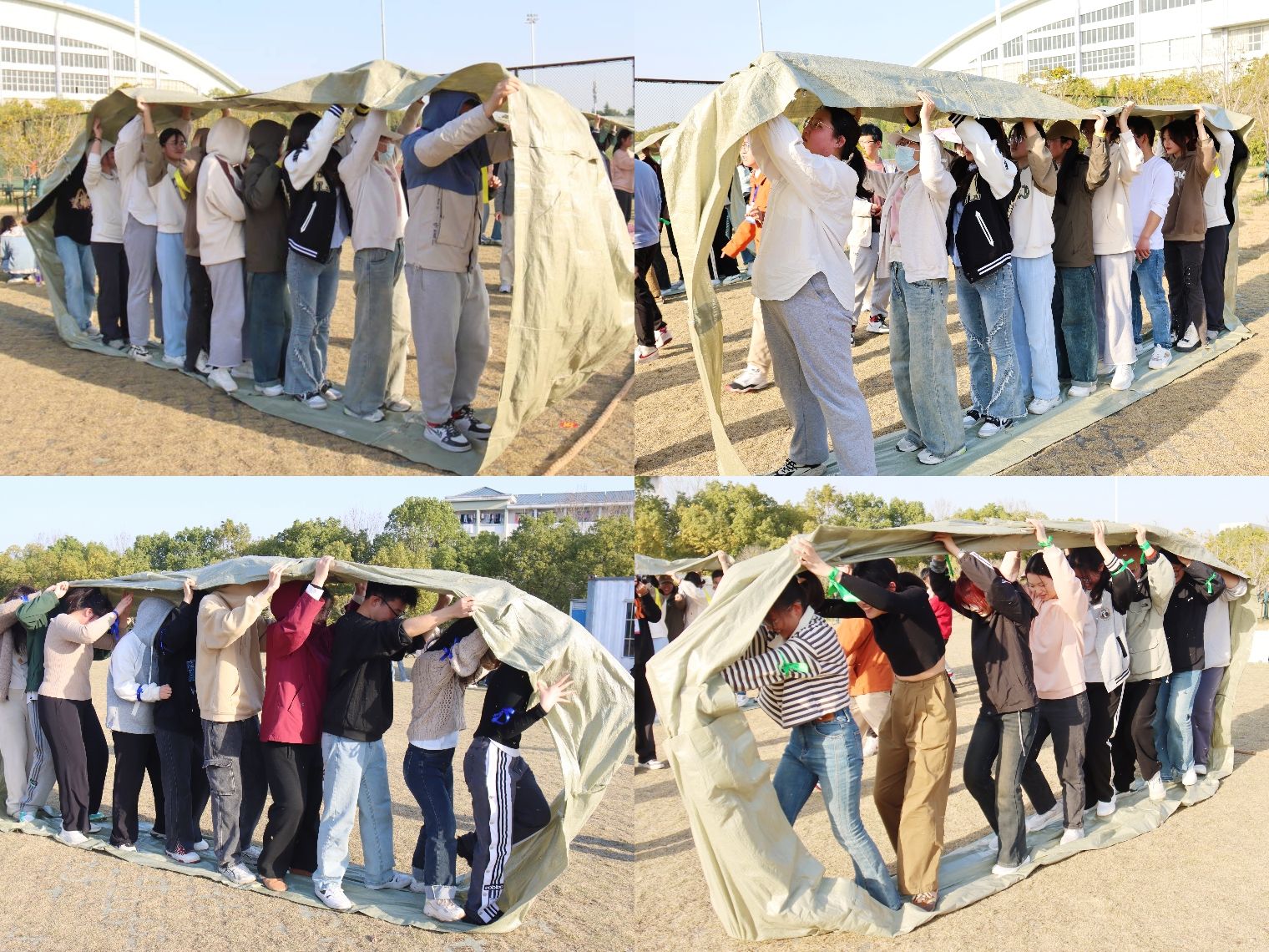 值得一提的是,本次素质拓展还注重竞技性与趣味性相结合,让更多的学生参与进来,享受运动的快乐。师生以团队形式开展了“五人六足”“花样跳大绳”“无敌风火轮”等富含趣味性和团队合作的拓展游戏。活动现场,同学们积极参与,师生默契配合。