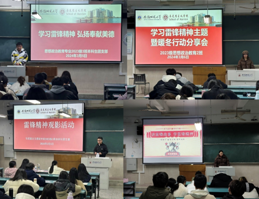 各班团支书以“学雷锋纪念日”为切入点,细致介绍了什么是雷锋精神以及学习雷锋精神对青年大学生塑造向上向善品格的重要性,并带领大家观看相关主题影片,让各位同学更能直观地感受雷锋精神。随后,各班分别进行了寒假暖冬行动分享会。同学们积极发言,踊跃上台分享自己在寒假中积极参与社区环境整治、关爱孤寡老人、为贫困地区儿童捐书捐物等各类志愿服务活动。同学们表示,通过参与志愿服务活动,不仅锻炼了自己的能力,还收获了成长和感动,更加深刻地理解了雷锋精神的内涵。
