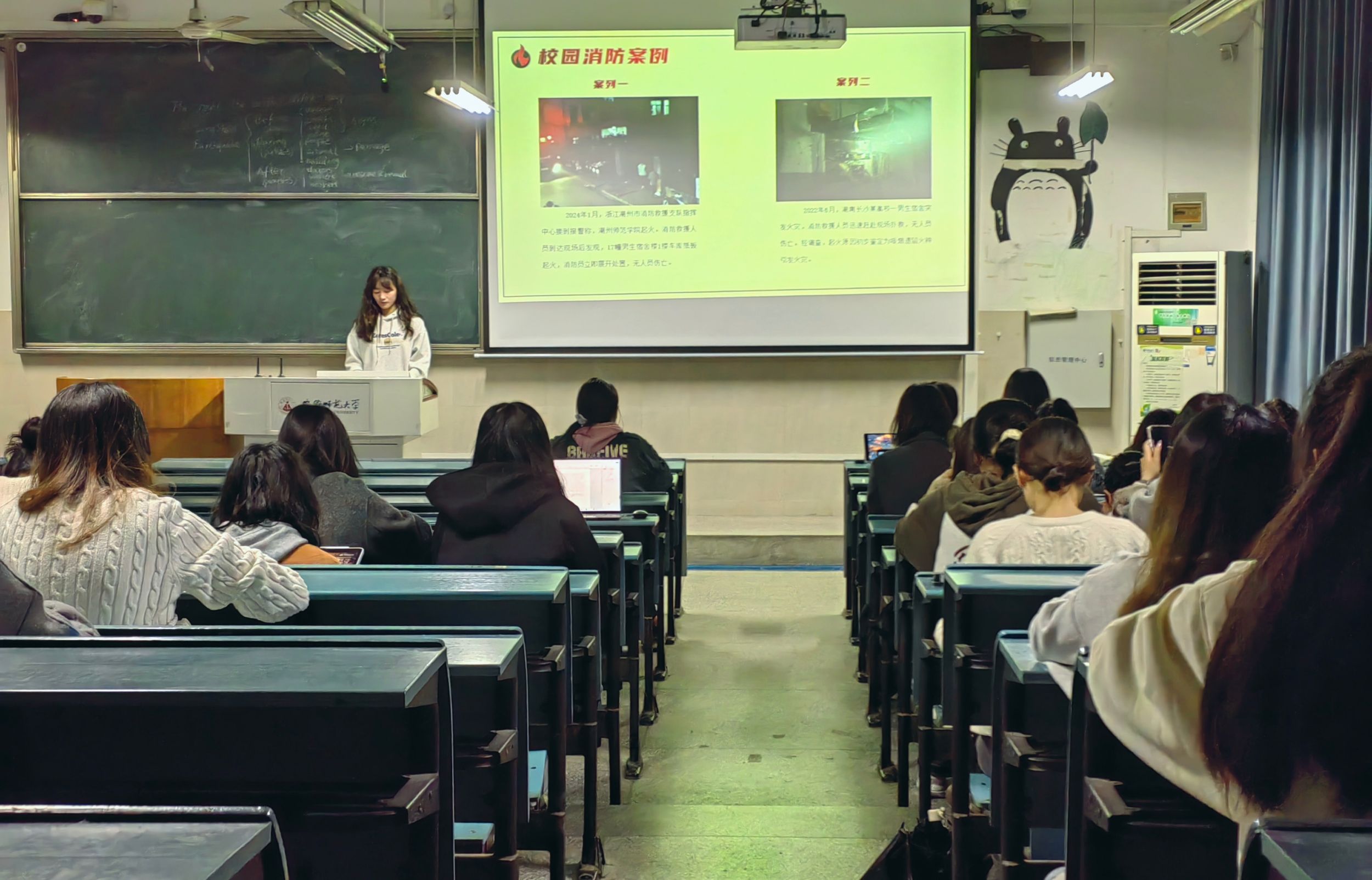 会上,陶雨洁运用丰富的生活事例,配合图片、数据、文字以及相关真实案例,从消防安全知识科普、火灾预防、灭火方法、火场逃生四个方面深入浅出地向同学们普及了消防安全知识。利用消防宣传教育海报,为同学们详细讲解了火灾的危害以及防火的重要性,并强调每个人都是防止火灾的第一道防线,呼吁大家在生活中要时刻关注消防安全,学习使用灭火器,切实做到防患于未然。