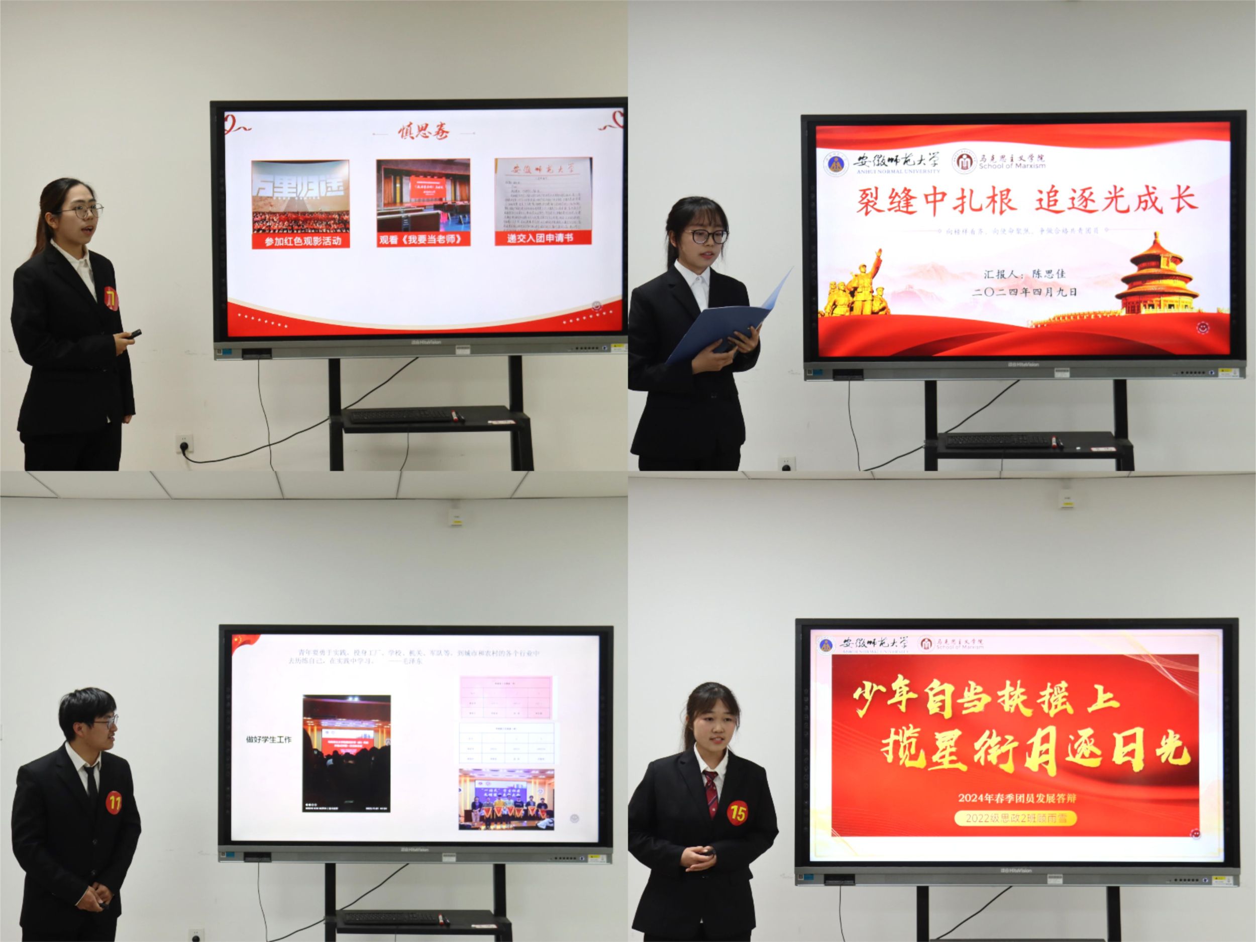 会上,17位答辩人从思想觉悟、社会实践、志愿服务、未来规划等方面进行汇报,表明坚定的入团信念和为团组织奉献的决心,他们表示今后会努力练就过硬本领,以实际行动为中华民族伟大复兴贡献青春力量。