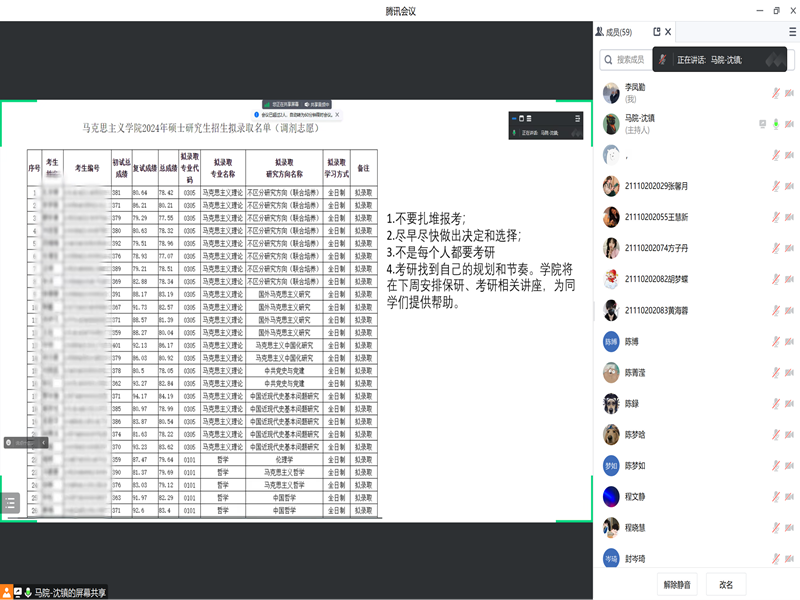 会上,沈镇从历年考研佳绩、择校选择、注意事项等相关内容为同学们详细分析考研形势,全面解读就业形势和当前最新的就业政策。他鼓励同学们大胆尝试,及时关注省内外的招考信息,提前熟知和准备考试内容,不断提升教学技能、逻辑思维、心理素质等能力,抓住宝贵的就业机会。他还就校纪校规、请假打卡制度、心理健康、防范电信诈骗、实习工作规定、入党答辩等班级日常管理事项对同学们进行适时提醒。他强调,同学们在实习中要自觉遵守实习学校的规章制度,在生活和工作中时刻注意师德师风,在教学实践中用理论武装头脑,在课堂教学中进一步提升师范生本领,争取在接下来的实习生涯中取得佳绩,为今后站稳讲台打下坚实基础。